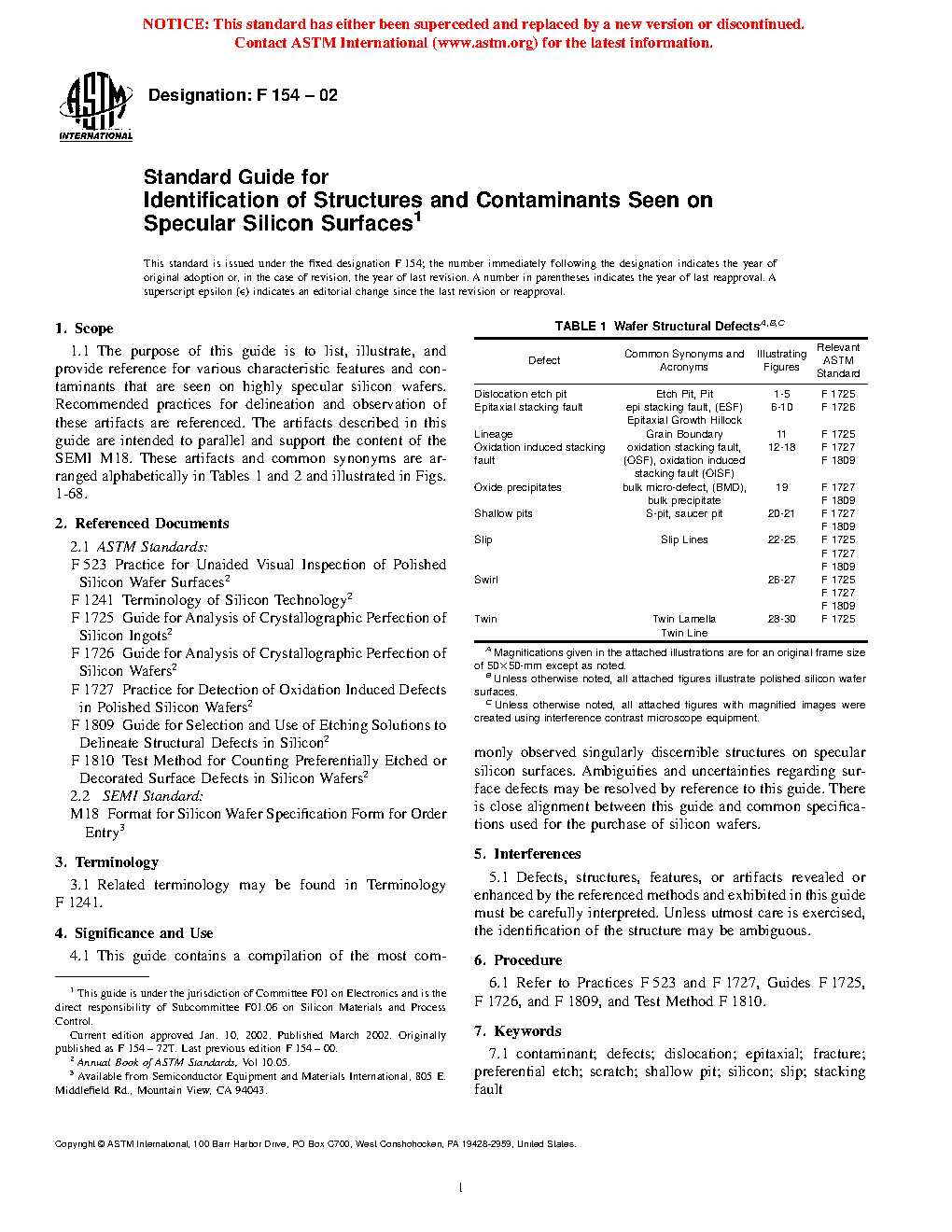 1.1 The purpose of this guide is to list, illustrate, and provide reference for various characteristic features and contaminants that are seen on highly specular silicon wafers. Recommended practices for delineation and observation of these artifacts are referenced. The artifacts described in this guide are intended to parallel and support the content of the SEMI M18. These artifacts and common synonyms are arranged alphabetically in Tables 1 and 2 and illustrated in Figs. 1-68 .