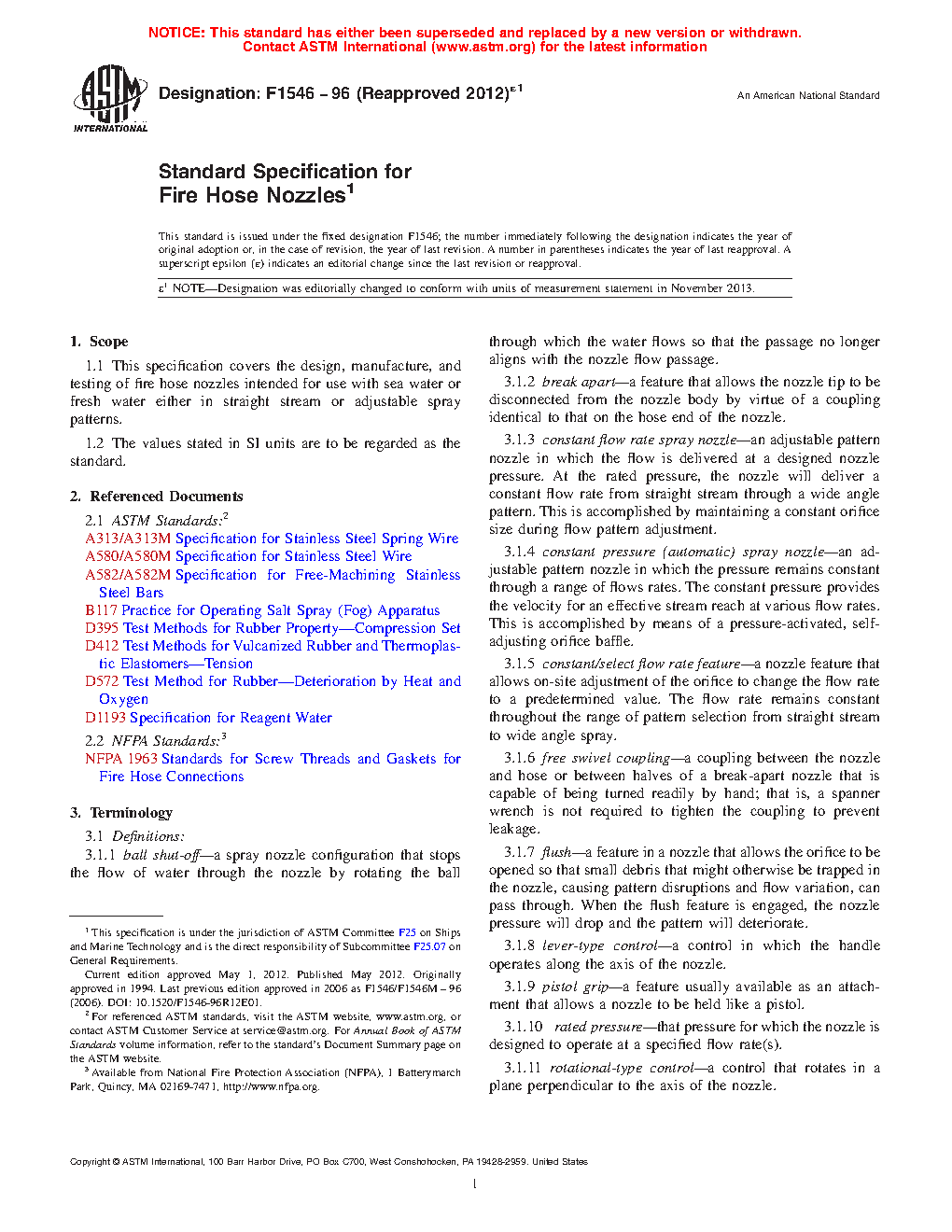 1.1 This specification covers the design, manufacture, and testing of fire hose nozzles intended for use with sea water or fresh water either in straight stream or adjustable spray patterns.
