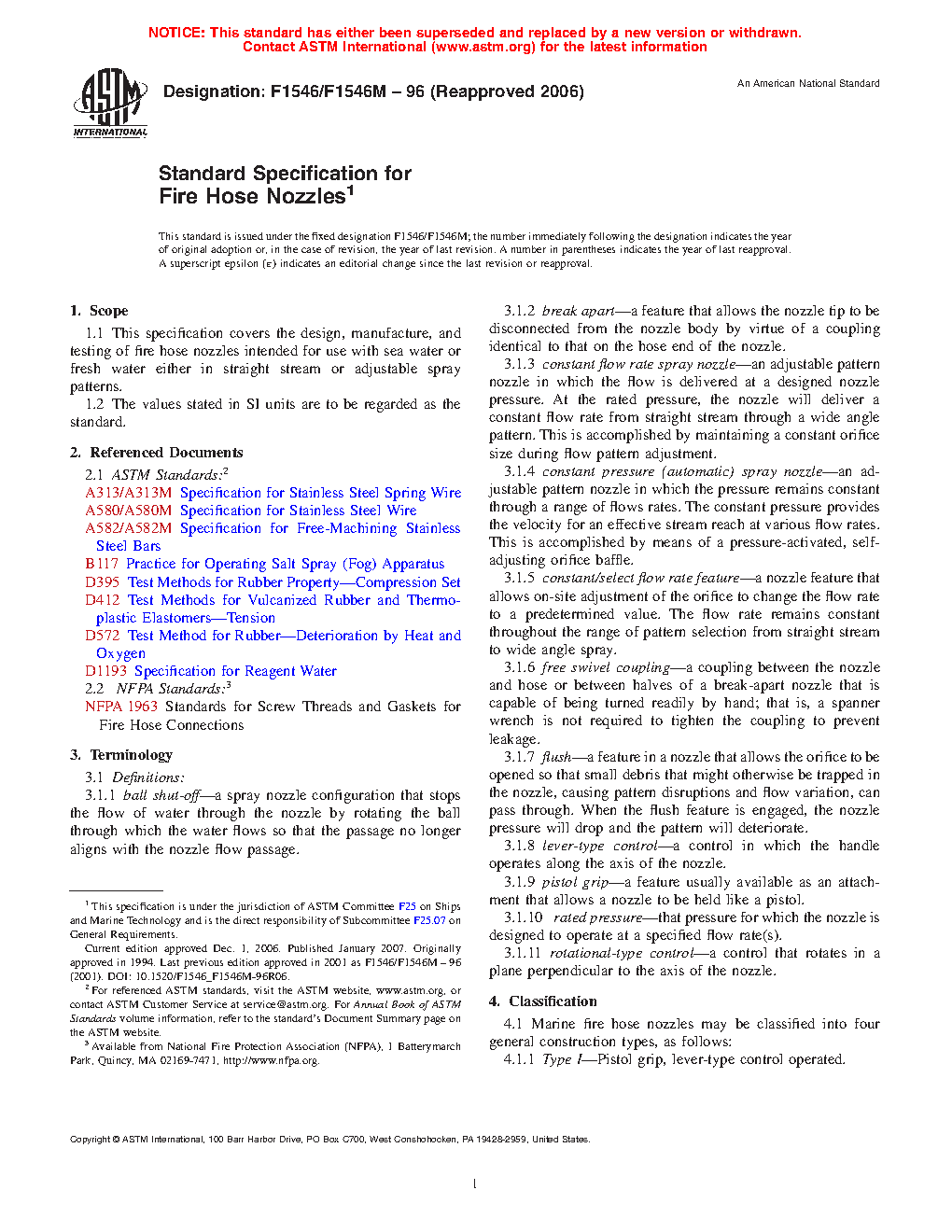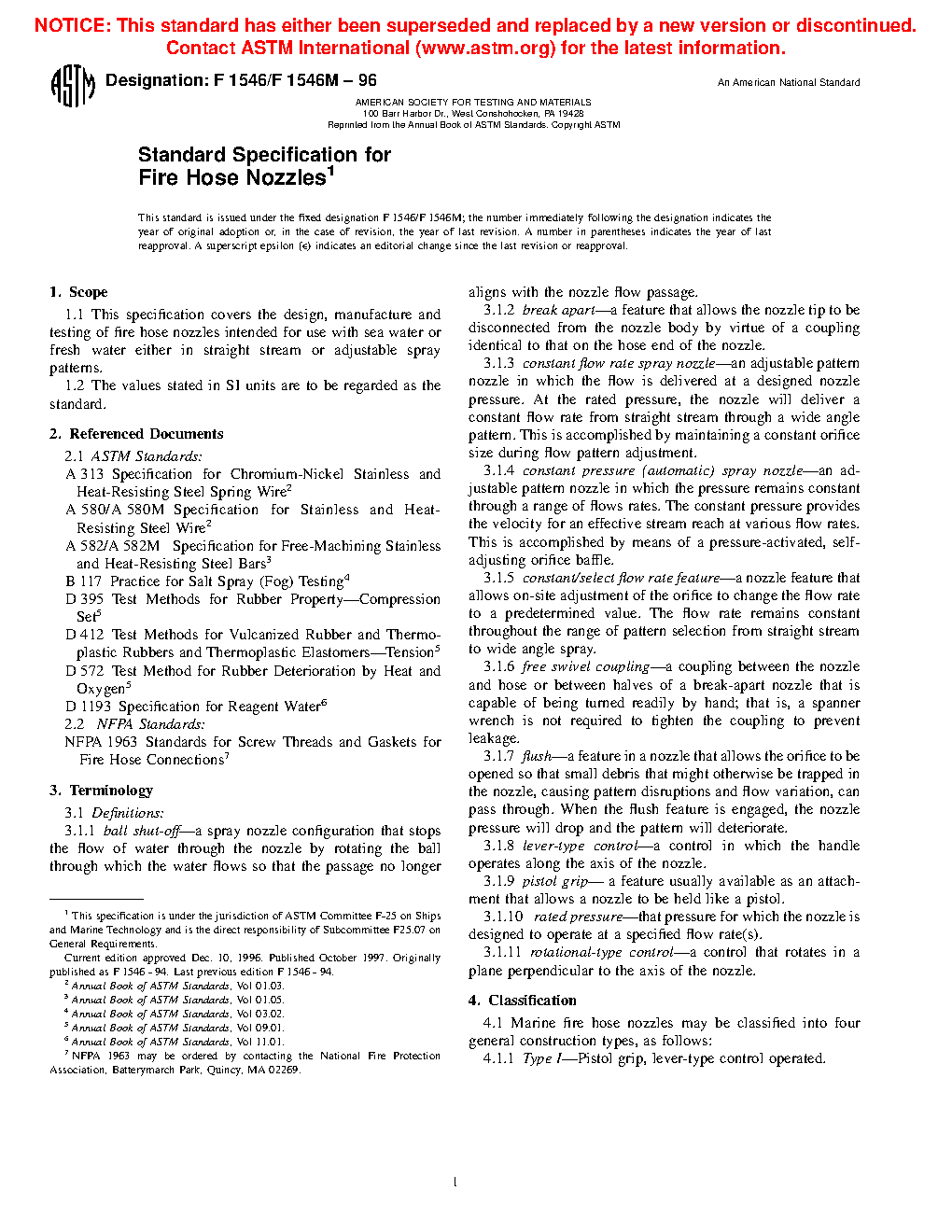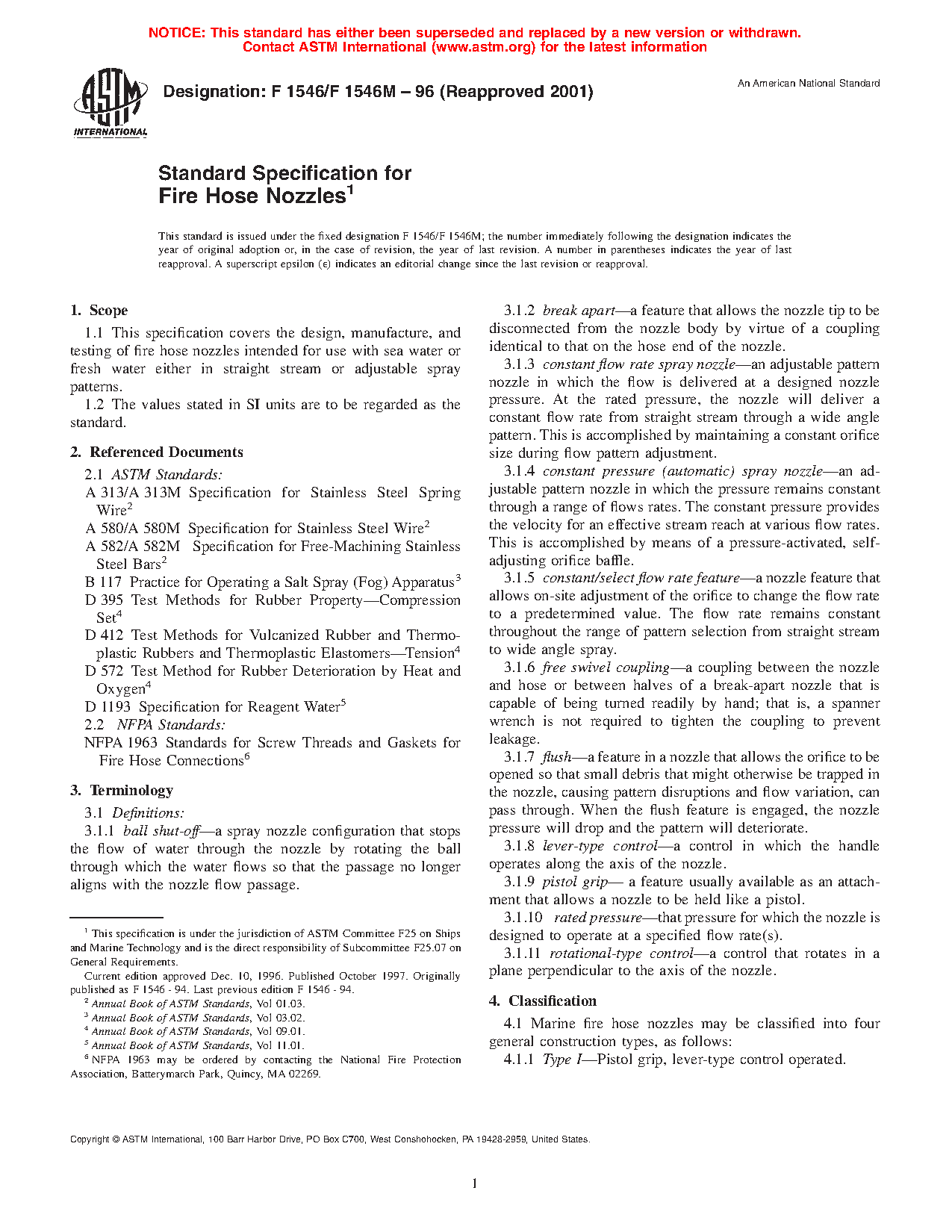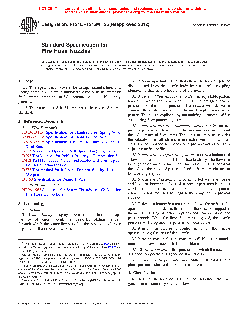 1.1 This specification covers the design, manufacture, and testing of fire hose nozzles intended for use with sea water or fresh water either in straight stream or adjustable spray patterns.