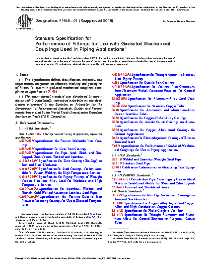 This specification defines classification, materials, test requirements, inspection certification, marking and packaging of fittings for use with gasketed mechanical couplings used in piping applications. These fittings are classified into the following design types: Type I and Type II. The design of the fittings may be qualified by mathematical analysis in accordance with piping codes.