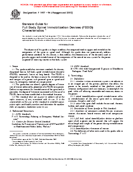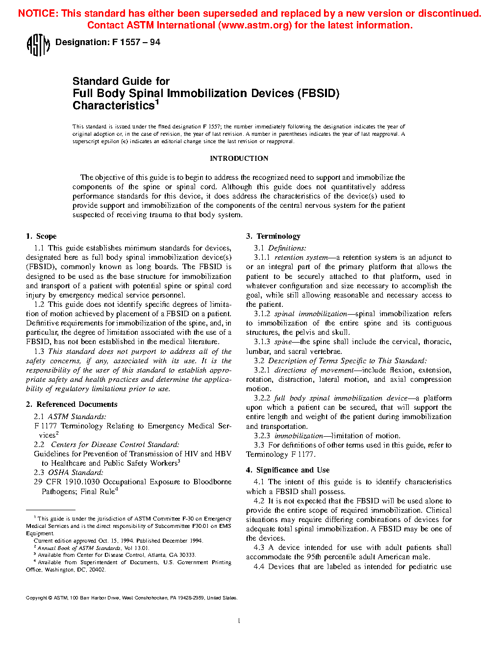 1.1 This guide establishes minimum standards for devices, designated here as full body spinal immobilization device(s) (FBSID), commonly known as long boards. The FBSID is designed to be used as the base structure for immobilization and transport of a patient with potential spine or spinal cord injury by emergency medical service personnel.