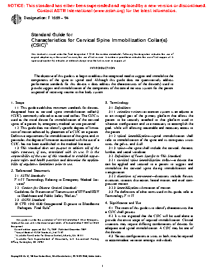 1.2 This guide does not identify specific degrees of limitation of motion achieved by placement of a CSIC on a patient. Definitive requirements for immobilization of the spine, and, in particular, the degree of limitation associated with the use of a CSIC, have not been established in the medical literature.