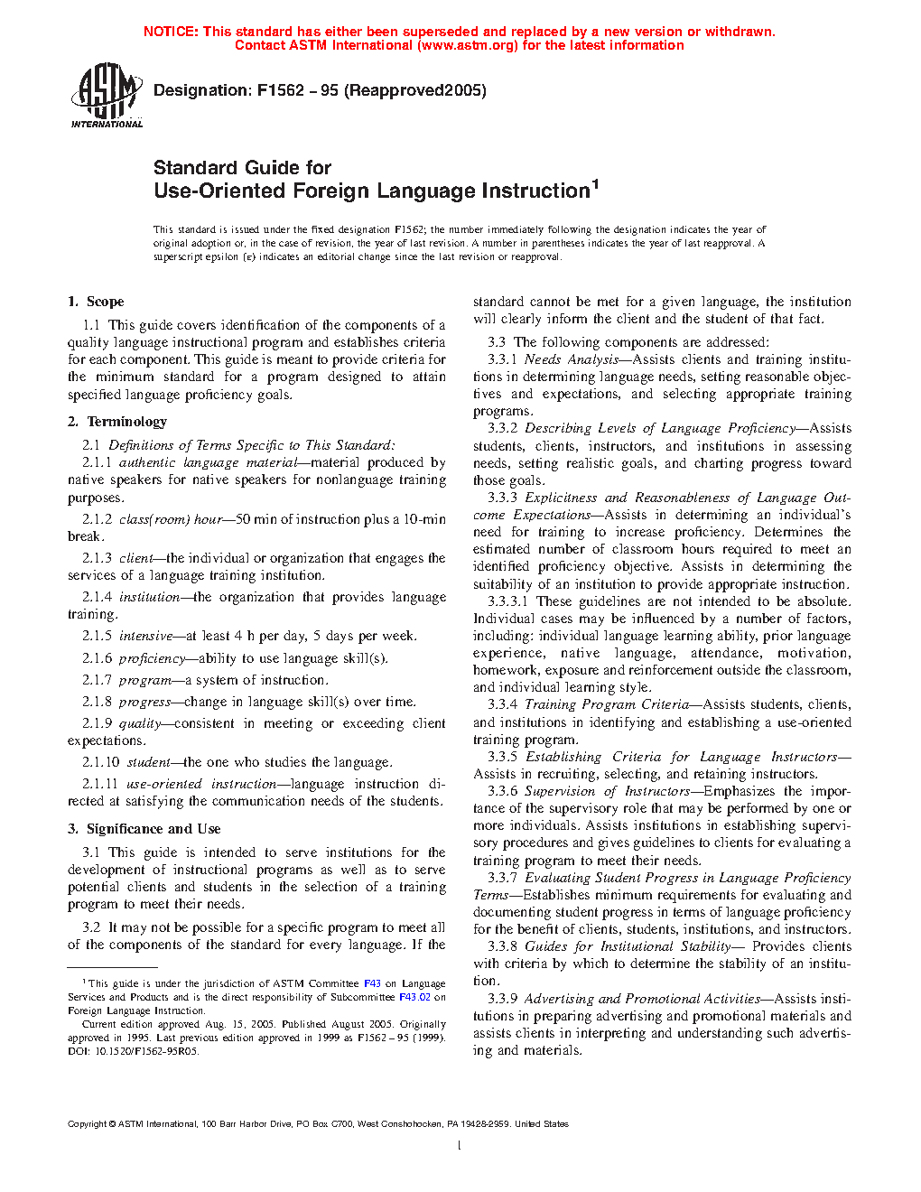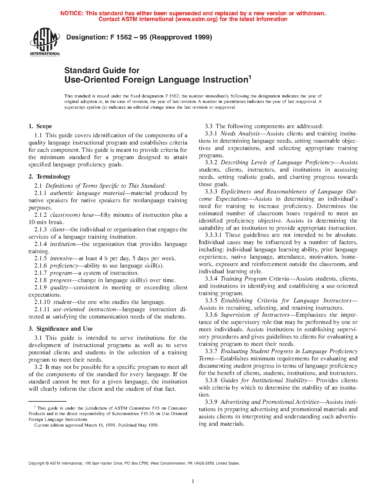 1.1 This guide covers identification of the components of a quality language instructional program and establishes criteria for each component. This guide is meant to provide criteria for the minimum standard for a program designed to attain specified language proficiency goals.