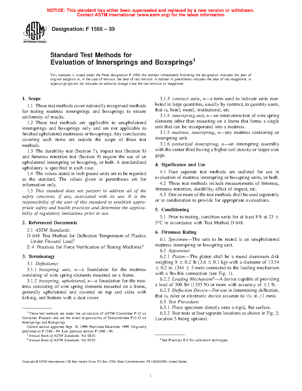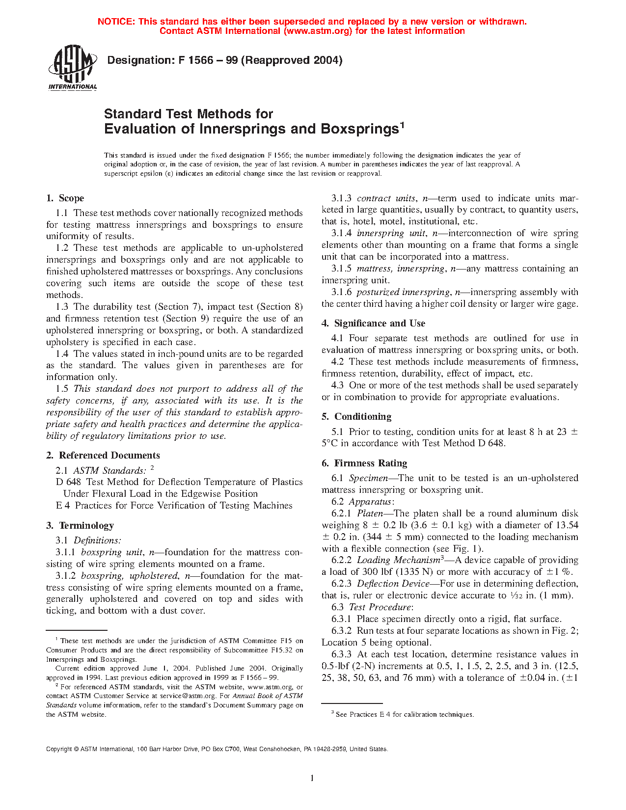 1.1 These test methods cover nationally recognized methods for testing mattress innersprings and boxsprings to ensure uniformity of results.