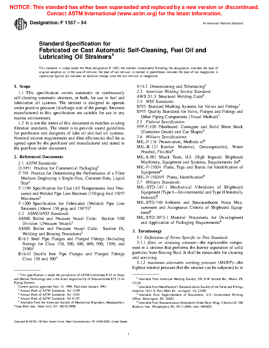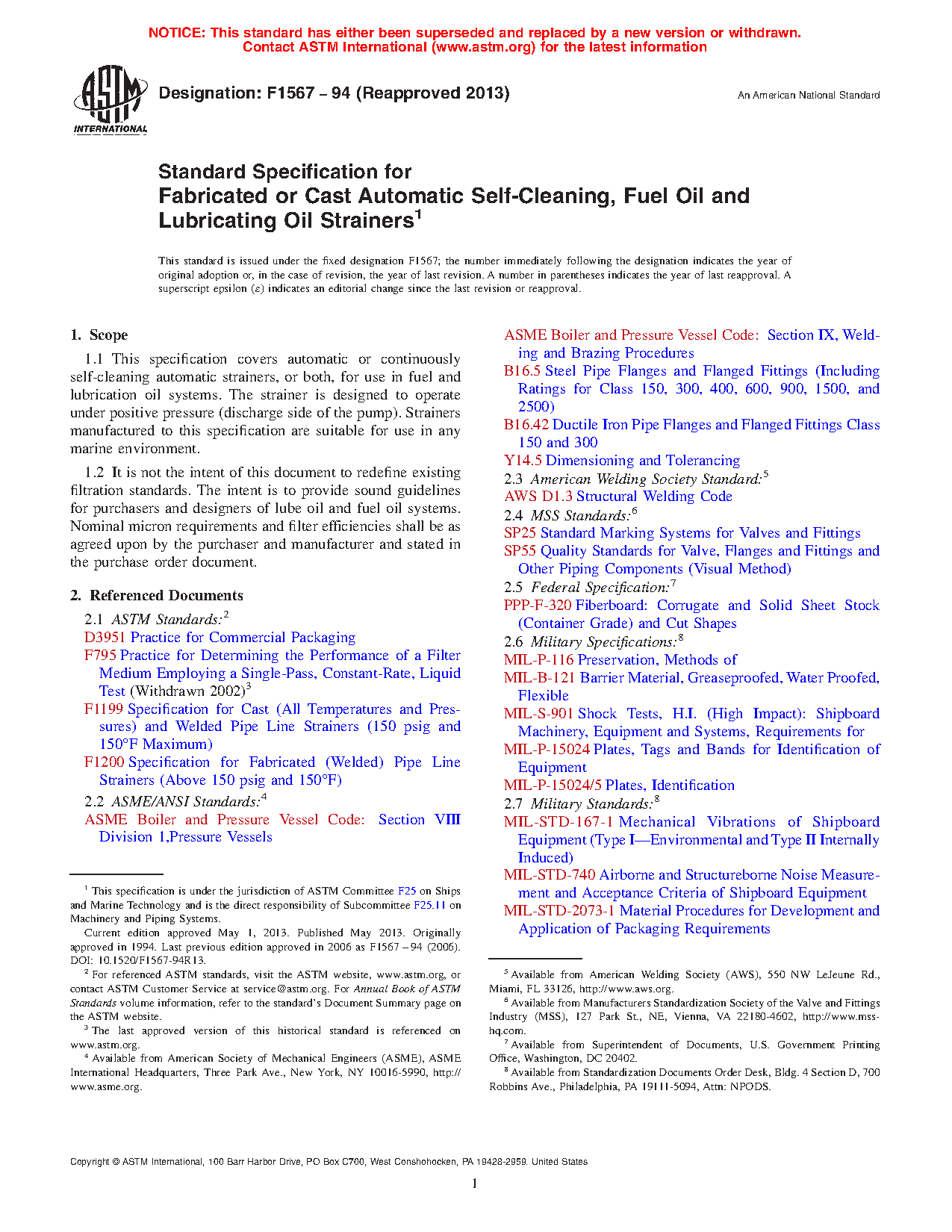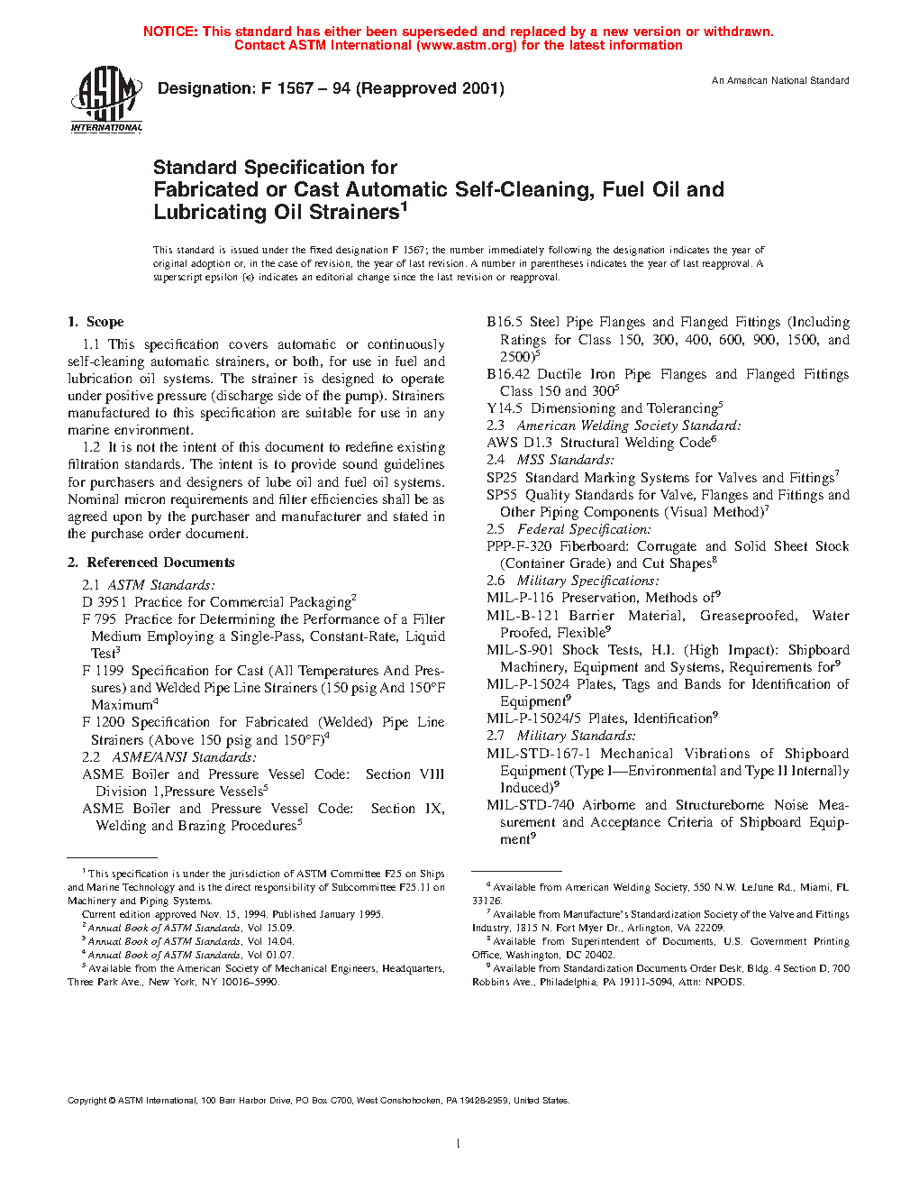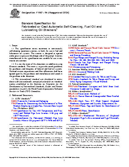 1.1 This specification covers automatic or continuously self-cleaning automatic strainers, or both, for use in fuel and lubrication oil systems. The strainer is designed to operate under positive pressure (discharge side of the pump). Strainers manufactured to this specification are suitable for use in any marine environment.