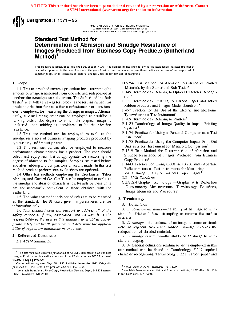 1.1 This test method covers a procedure for determining the amount of image transferred from one site and redeposited at another site (smudge) on a document. The Sutherland Ink Rub Tester with 4-lb (1.82-kg) test block is the test instrument for producing the transfer and either a reflectometer or densitometer is employed for measuring the change in images. Alternatively, a visual rating order can be employed to establish a ranking order. The degree to which the original image is unaltered upon rubbing is considered to be the abrasion resistance.