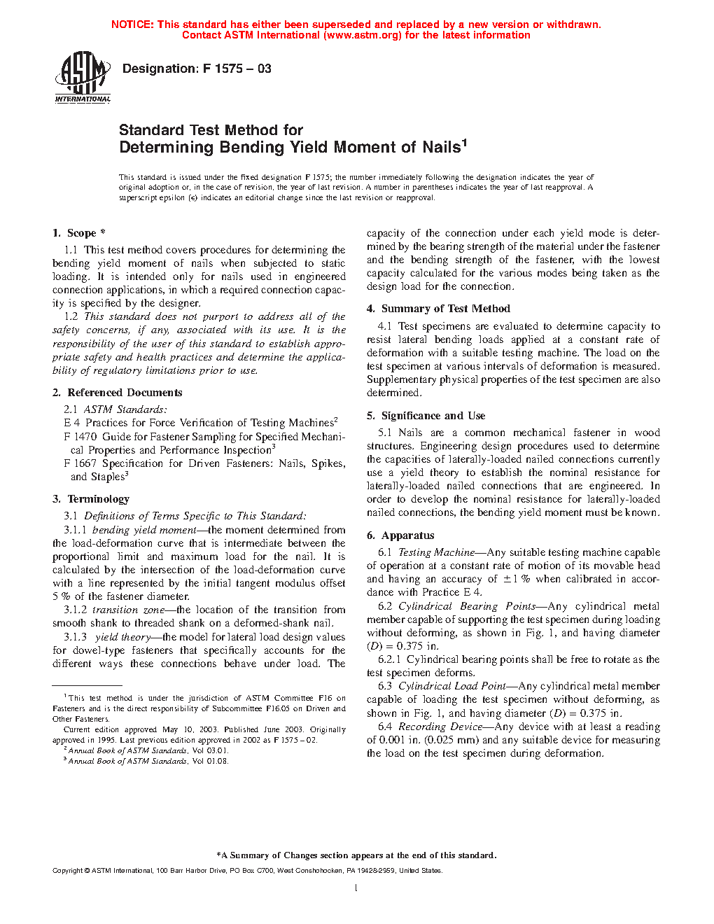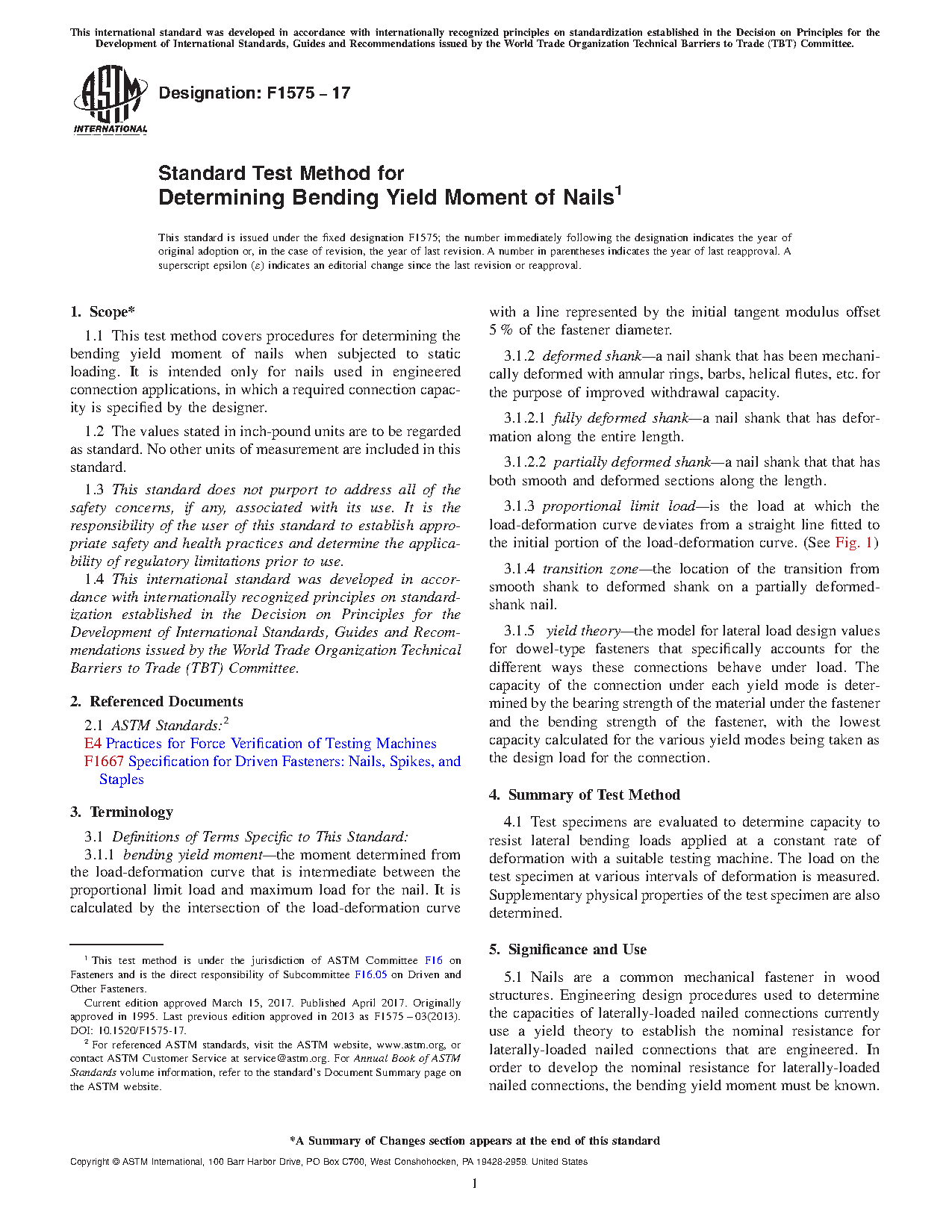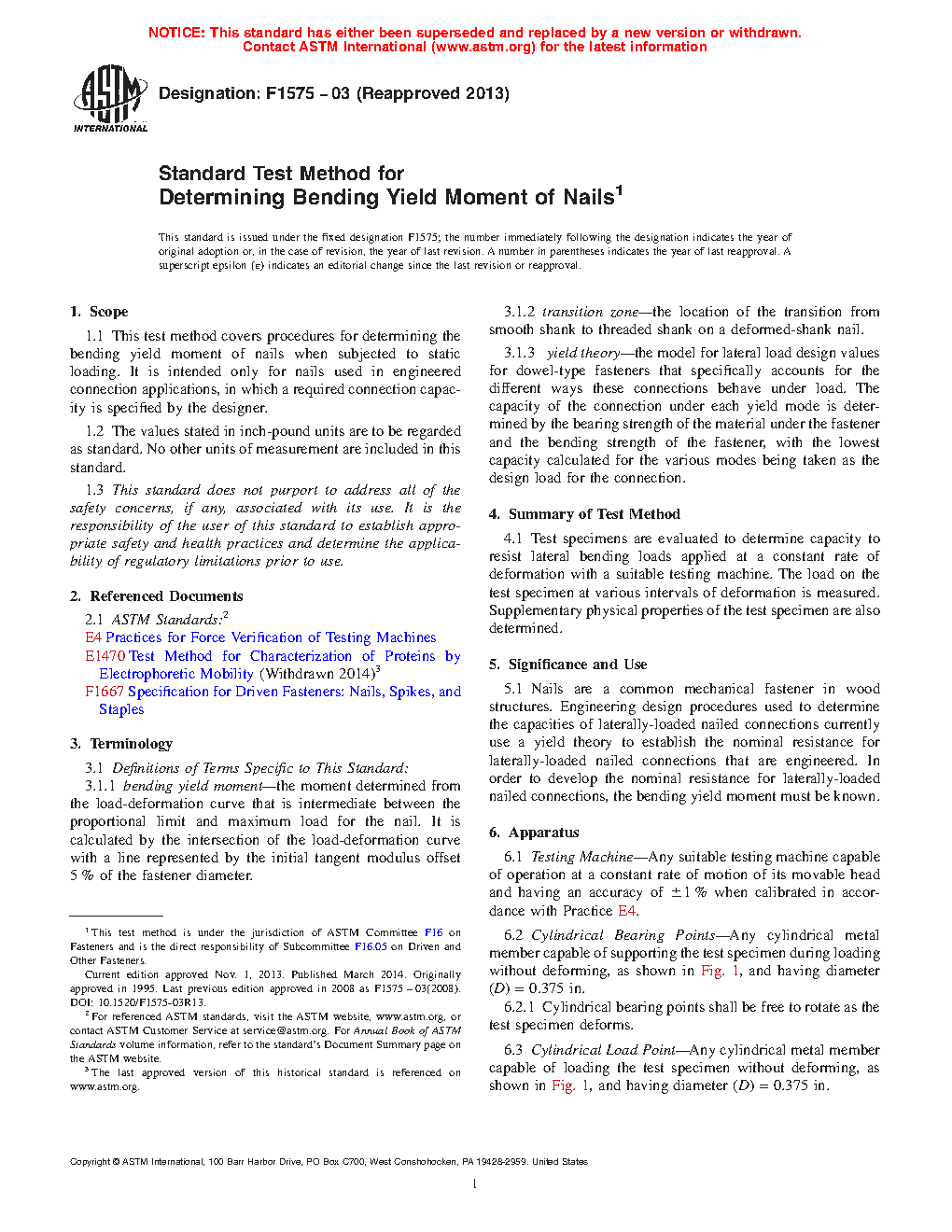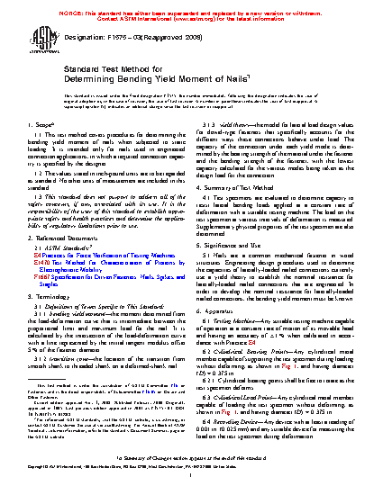 1.1 This test method covers procedures for determining the bending yield moment of nails when subjected to static loading. It is intended only for nails used in engineered connection applications, in which a required connection capacity is specified by the designer.