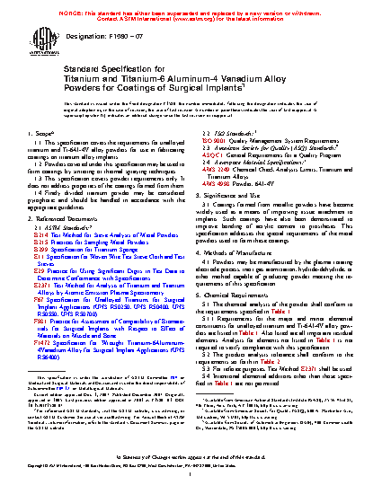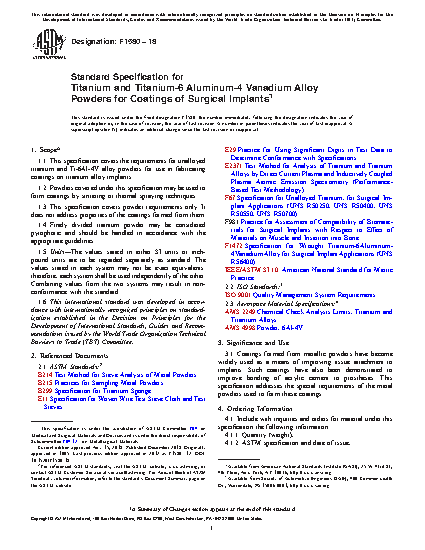 This specification covers the chemical, particle size, and cleanliness requirements for unalloyed titanium and titanium-6aluminum-4vanadium alloy powders for use as coatings, formed by sintering or thermal spraying techniques, onto titanium alloy surgical implants. The powders may be manufactured by the plasma rotating electrode, inert gas atomization, or hydride-dehydride process, or other method capable of producing powder meeting the requirements of this specification. This specification addresses only the powder requirements, and not the properties of the coatings formed from them.