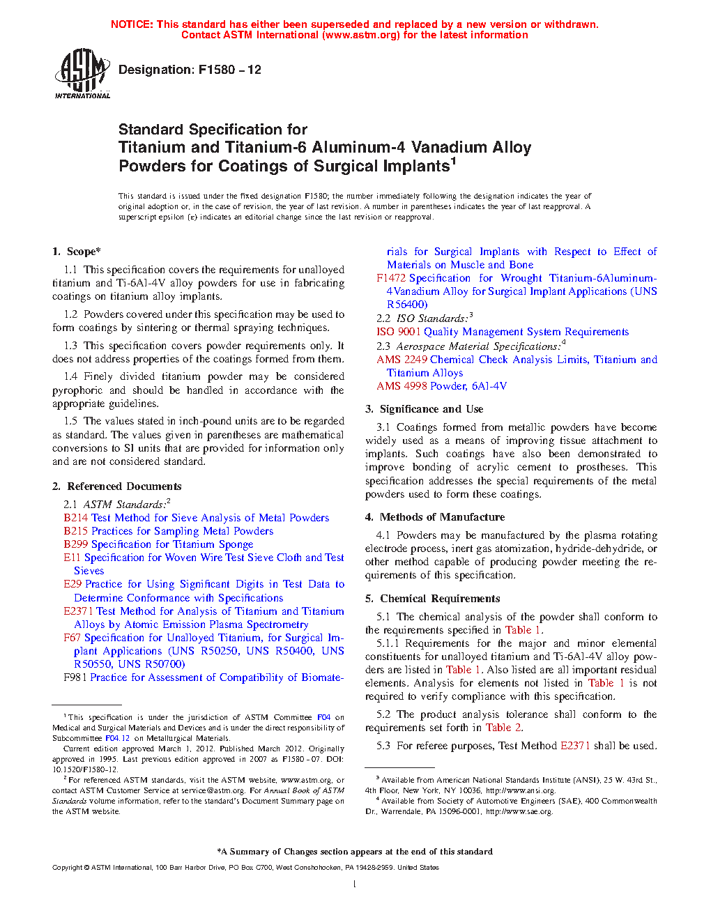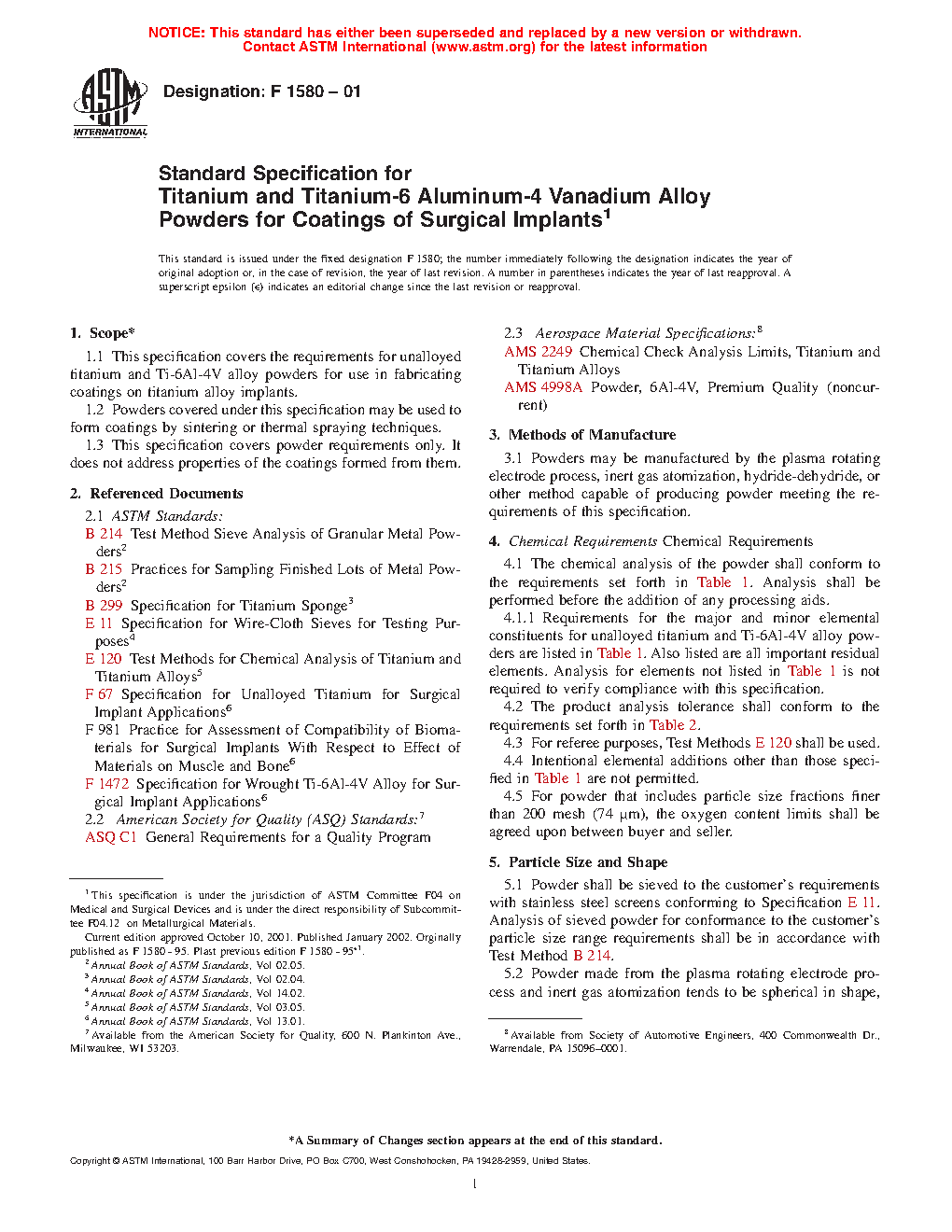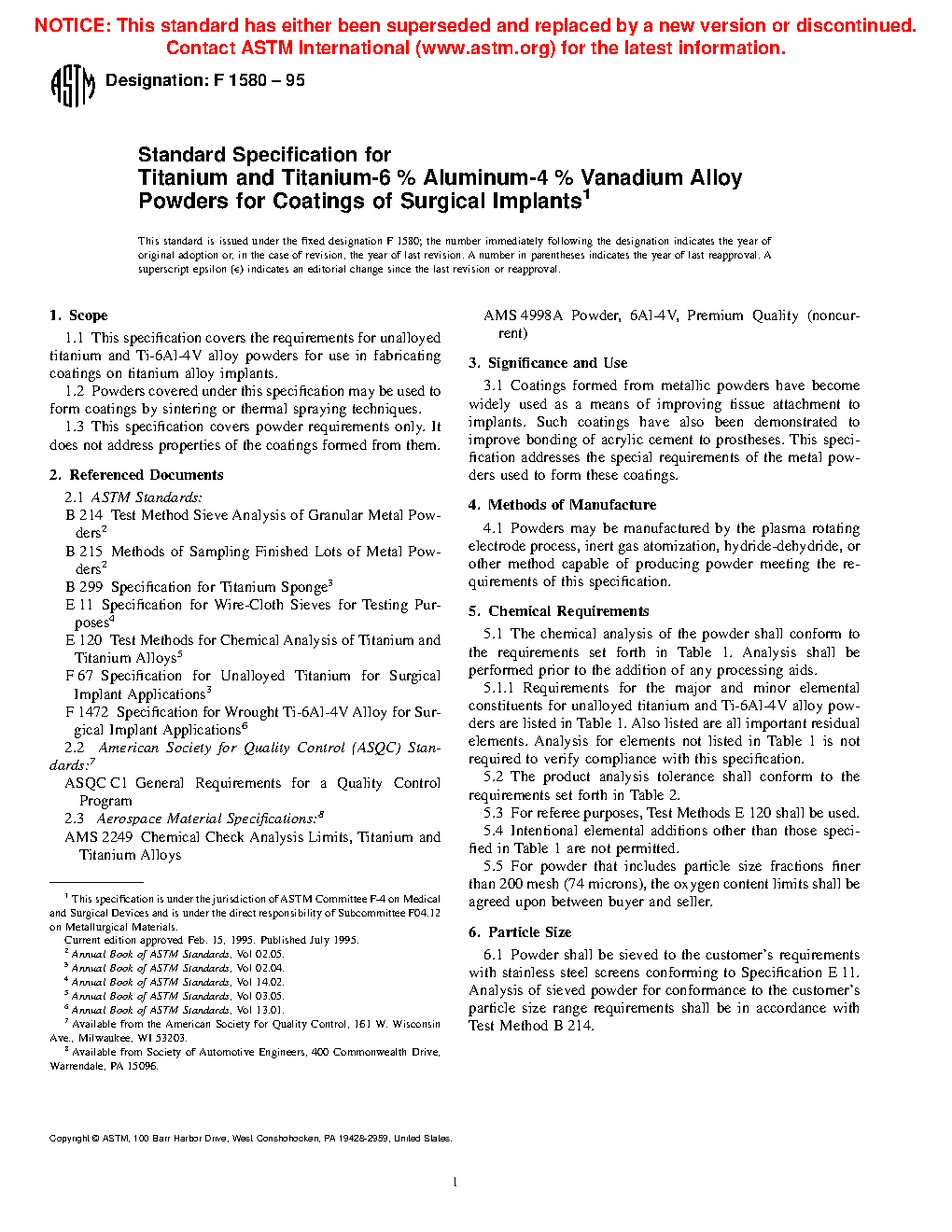 1.1 This specification covers the requirements for unalloyed titanium and Ti-6Al-4V alloy powders for use in fabricating coatings on titanium alloy implants.