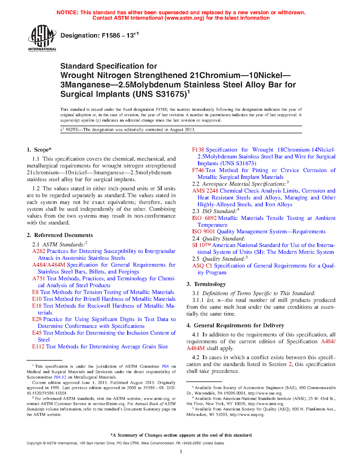 This specification covers the chemical composition, mechanical, and metallurgical requirements for wrought nitrogen strengthened 21chromium-10nickel-3manganese-2.5molybdenum stainless steel alloy bars for use in surgical implants. The alloy bars shall be furnished in the annealed, medium hard, or hard condition, and shall be finished cold-drawn, pickled, ground, ground and polished, or as specified by the purchaser.