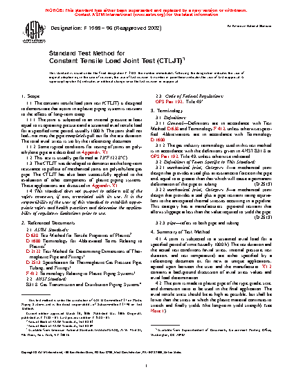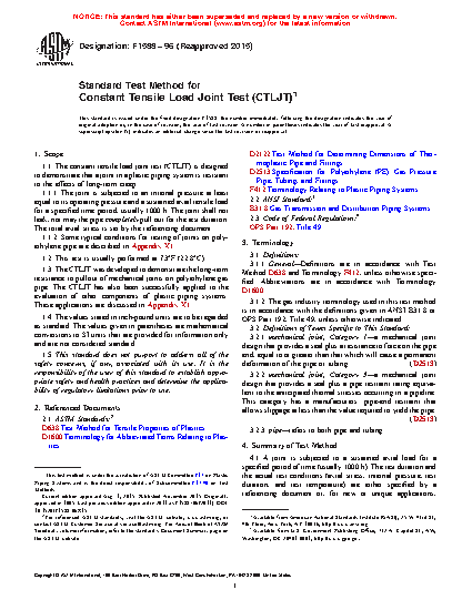 1.1 The constant tensile load joint test (CTLJT) is designed to demonstrate that a joint in a plastic piping system is resistant to the effects of long-term creep.