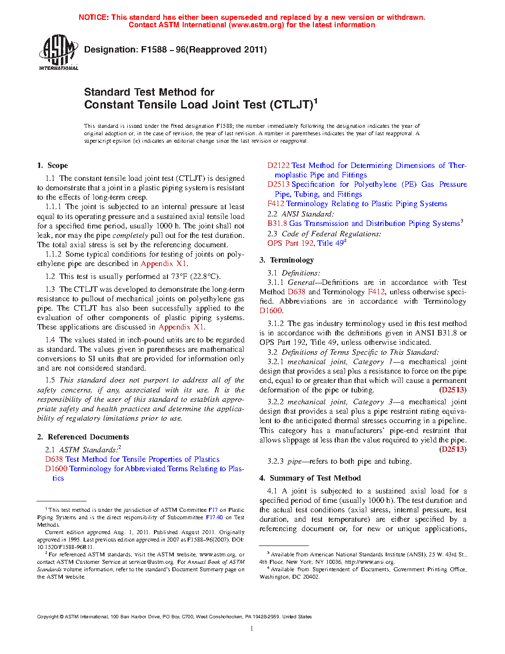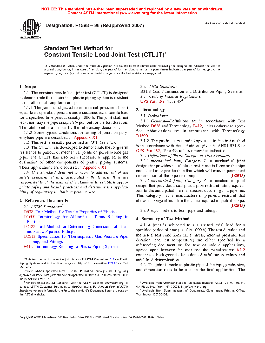 5.2 This test method is used in addition to the short-term tests required by OPS Part 192.283b, Title 49. Informal versions of this test method are used by manufacturers and utilities to demonstrate that a joint is resistant to the effects of long-term creep and meets the requirements for classification as a Category 1 or a Category 3 joint in accordance with Specification D2513.