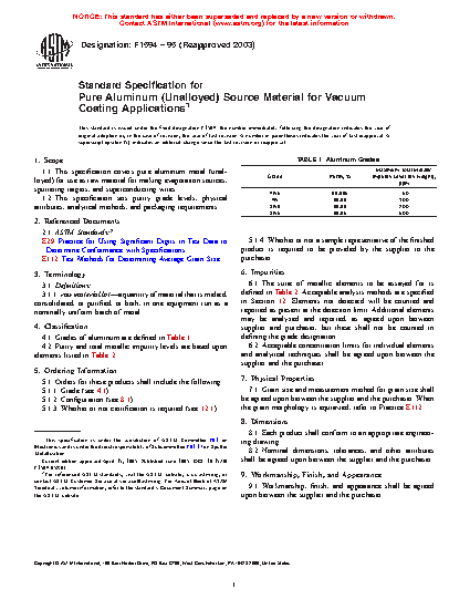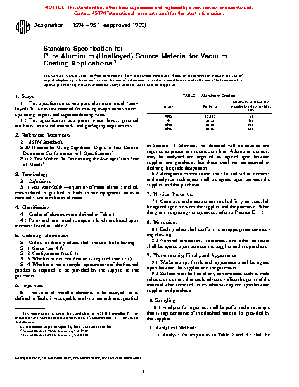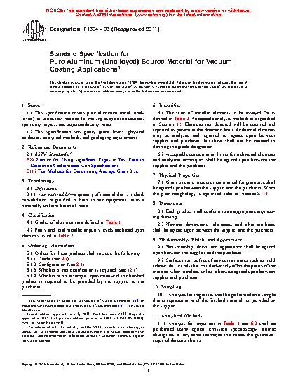 Standard Specification for Pure Aluminum (Unalloyed) Source Material for Vacuum Coating Applications