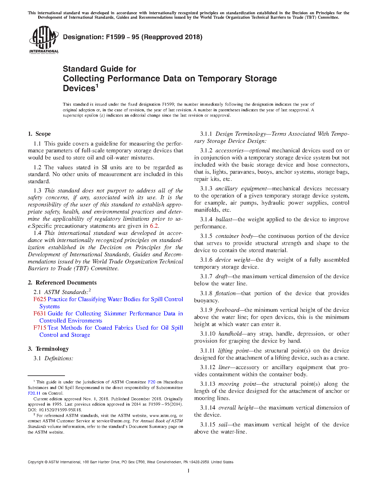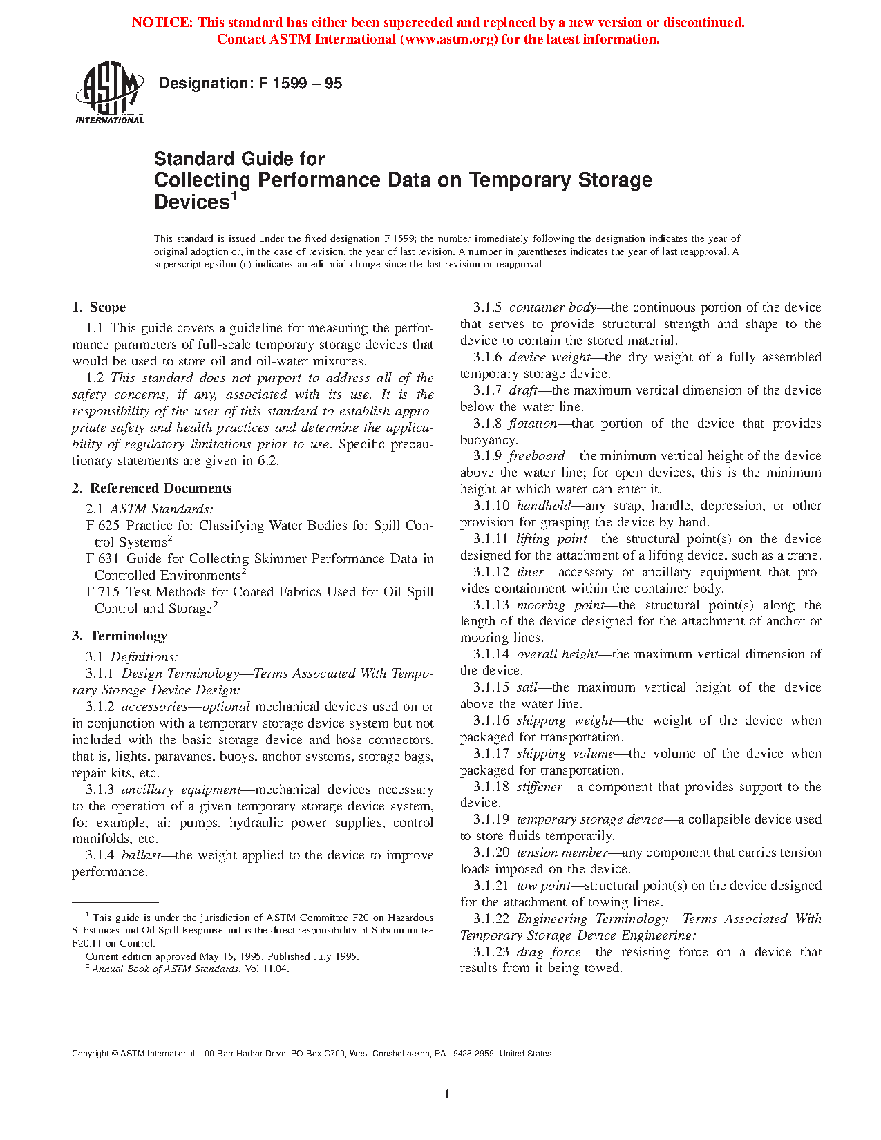 This guide covers the collection of quantitative data in the form of storage capacity, strength of materials, filling and offloading rates, and towability under controlled test conditions. The data can be used for evaluating the design characteristics of a particular temporary storage device or as a means of comparing two or more devices. Caution must be exercised whenever the test data are used to predict performance in actual spill situations since the uncontrolled environmental conditions that affect performance in the field are rarely identical to conditions in the test facility. Other variables such as mechanical reliability, the presence of debris, ease of repair, required operator training, operator fatigue, and transportability also affect performance in an actual spill but are not included in this guide. These variables should be considered along with the test data when making comparisons or evaluations of temporary storage devices.