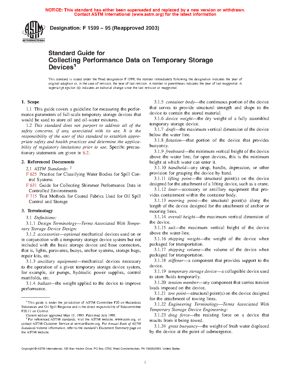 Although this guide provides data on the performance of temporary storage devices, all of the combinations of actual conditions of use are not simulated in this series of tests. In particular, the resistance of the device to grounding, abrasion resistance of the container body, venting of the device during loading, and other operational issues not covered by this guide should be considered along with the test data when making comparisons or evaluations of temporary storage devices.