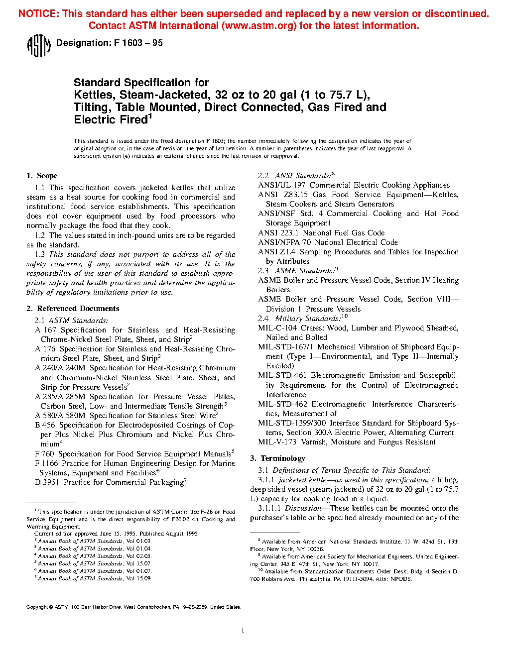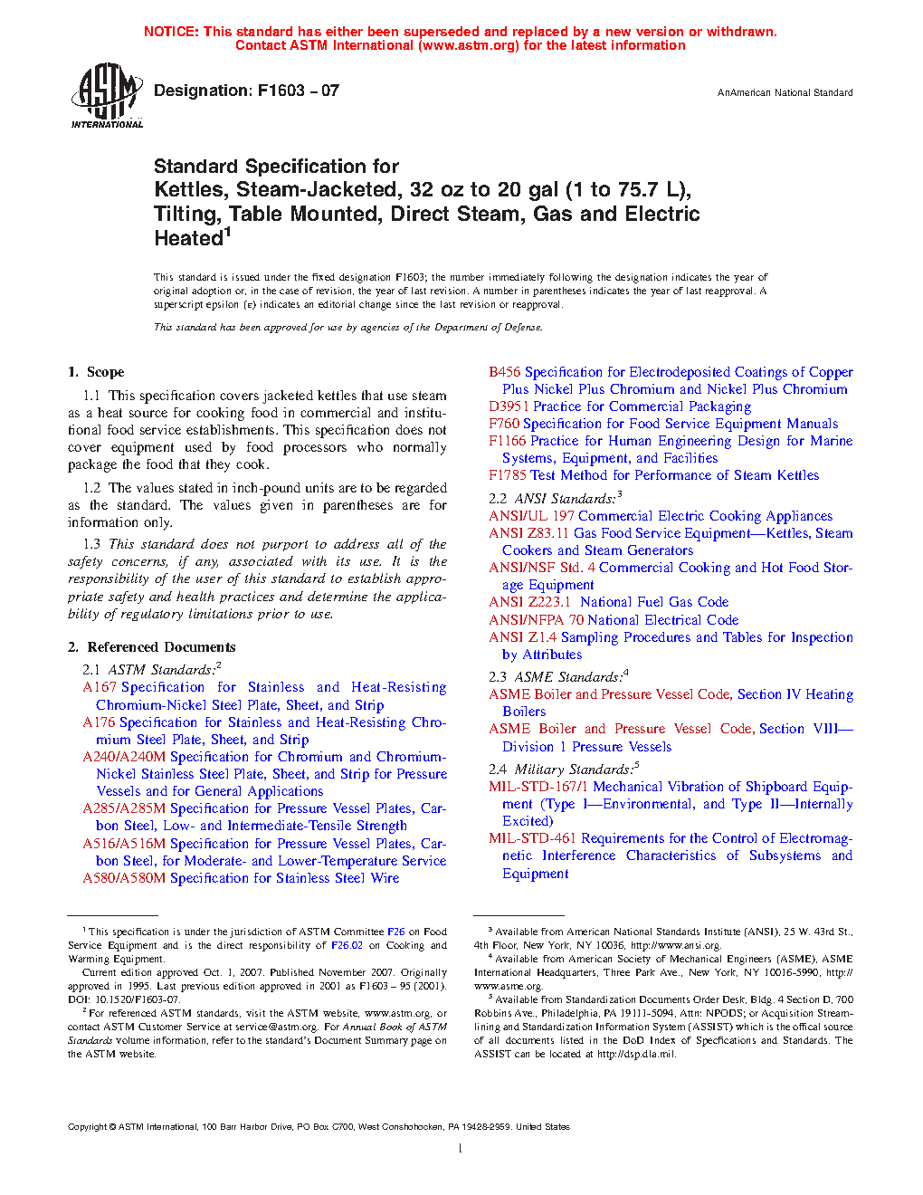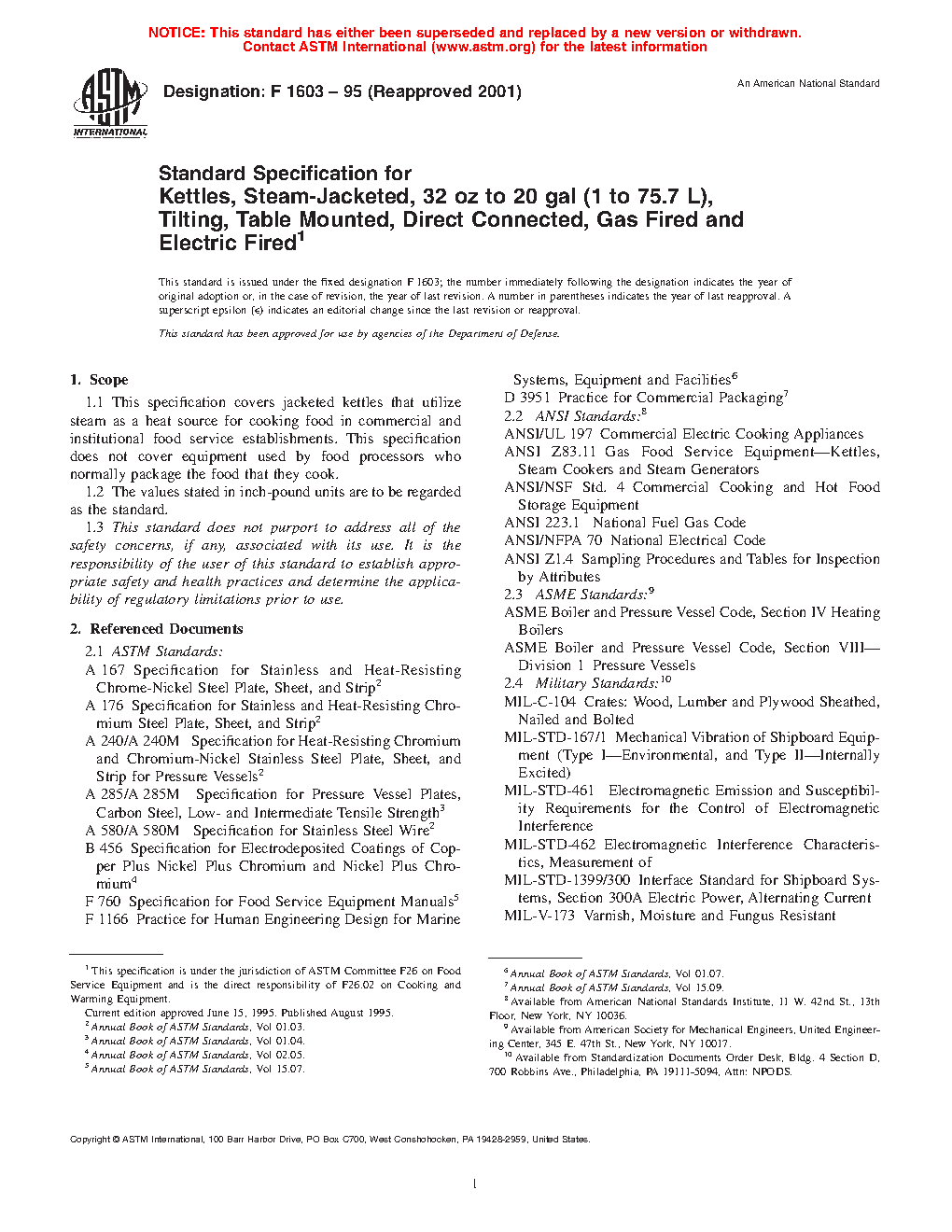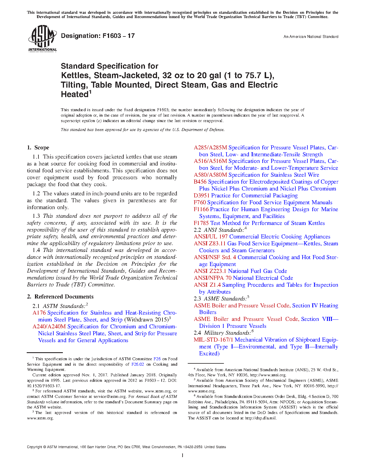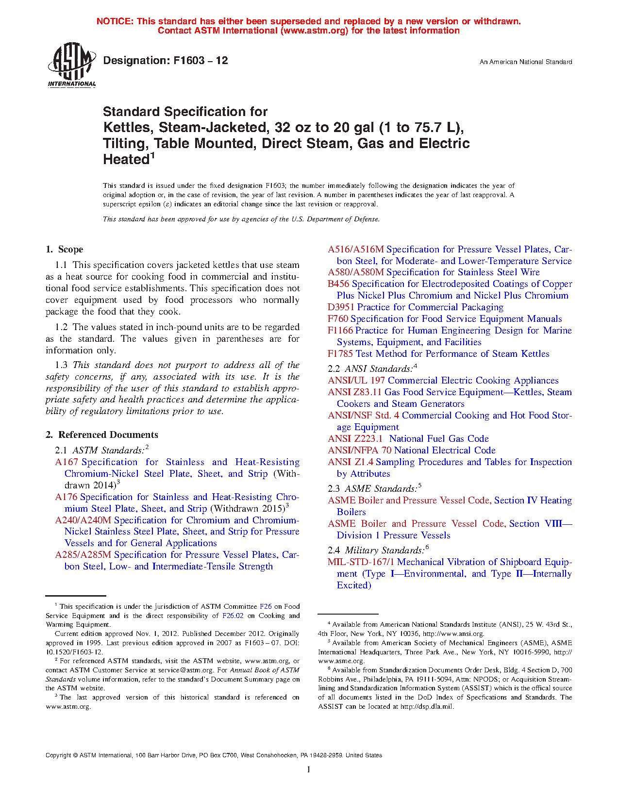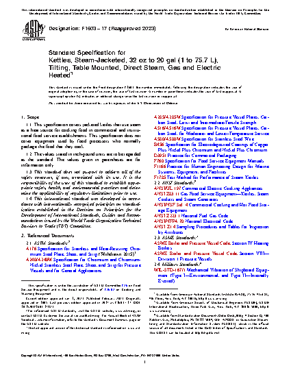 1.1 This specification covers jacketed kettles that use steam as a heat source for cooking food in commercial and institutional food service establishments. This specification does not cover equipment used by food processors who normally package the food that they cook.