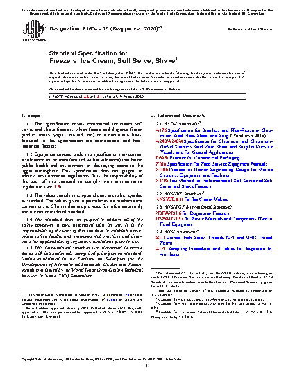 1.1 This specification covers commercial ice cream, soft serve, and shake freezers, which freeze and dispense frozen product (dairy, yogurt, custard, etc.) on a continuous basis. Included in this specification are conventional and heat-treatment freezers.