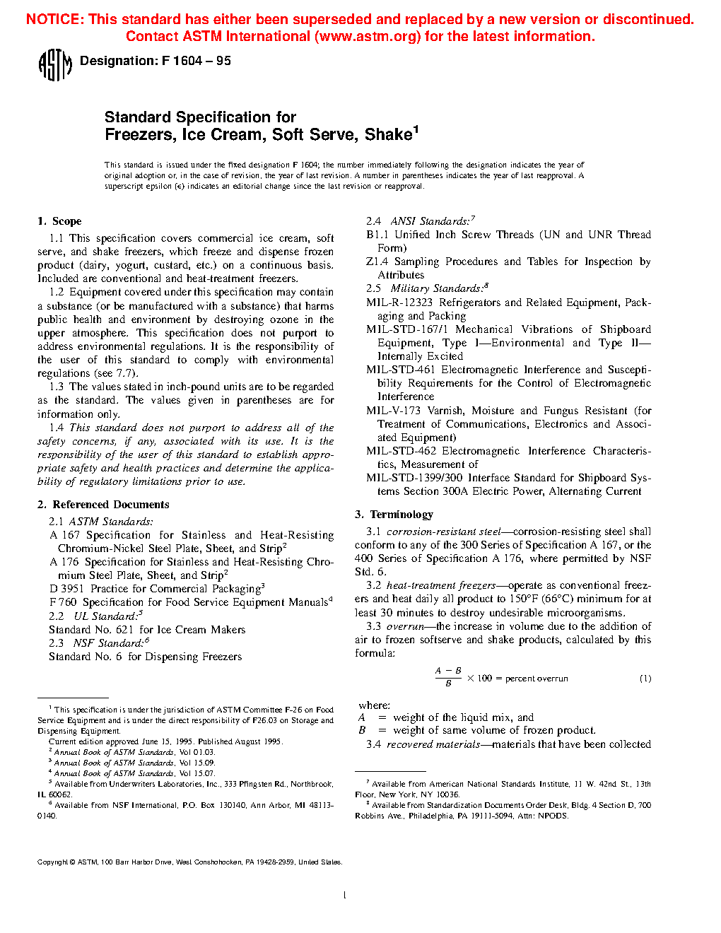 1.1 This specification covers commercial ice cream, soft serve, and shake freezers, which freeze and dispense frozen product (dairy, yogurt, custard, etc.) on a continuous basis. Included are conventional and heat-treatment freezers.