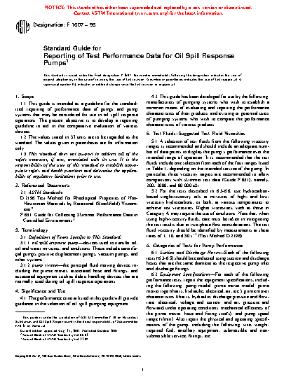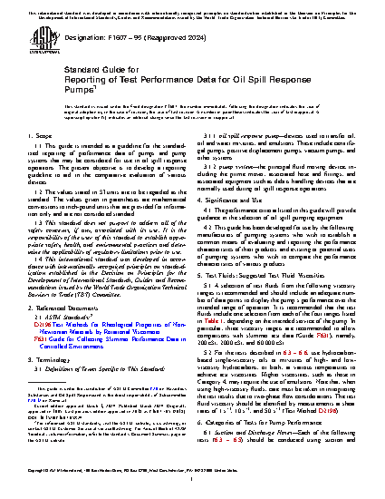 1.1 This guide is intended as a guideline for the standardized reporting of performance data of pumps and pump systems that may be considered for use in oil spill response operations. The present objective is to develop a reporting guideline to aid in the comparative evaluation of various devices.