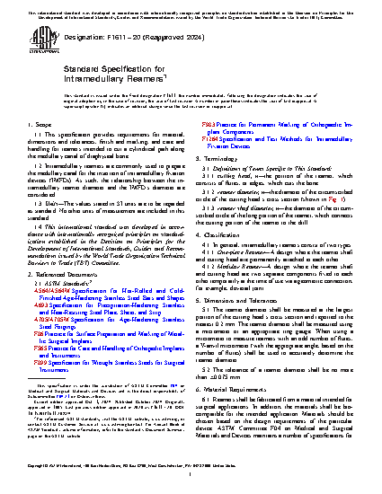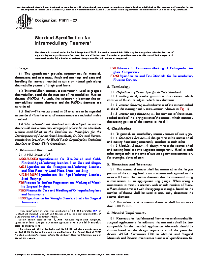 This specification provides requirements for material, dimensions and tolerances, finish and marking, and care and handling for reamers intended to cut a cylindrical path along the medullary canal of diaphyseal bone. Intramedullary reamers are commonly used to prepare the medullary canal for the insertion of intramedullary fixation devices (IMFD). As such, the relationship between the intramedullary reamer diameter and the IMFD's diameter are considered. In general, intramedullary reamers consist of two types: one-piece reamer—a design where the reamer shaft and cutting head are permanently attached to each other; and Modular Reamer—a design where the reamer shaft and cutting head are two separate components, fixed to each other temporarily at the time of use via a geometric connection, for example, dovetail joint.