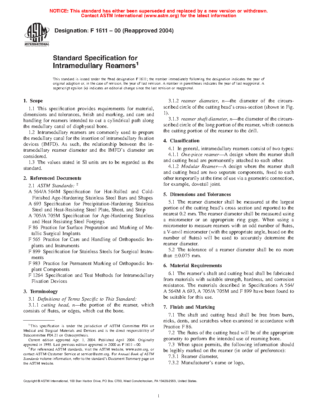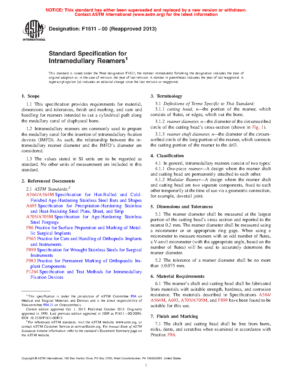 1.1 This specification provides requirements for material, dimensions and tolerances, finish and marking, and care and handling for reamers intended to cut a cylindrical path along the medullary canal of diaphyseal bone.