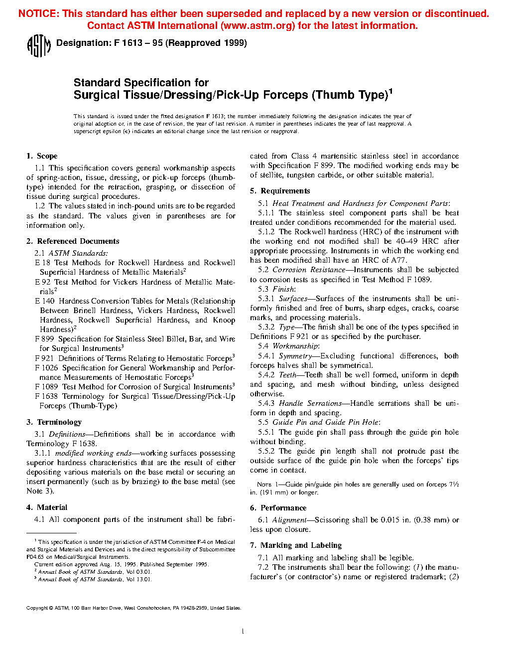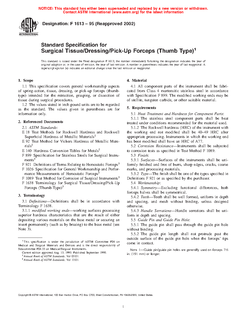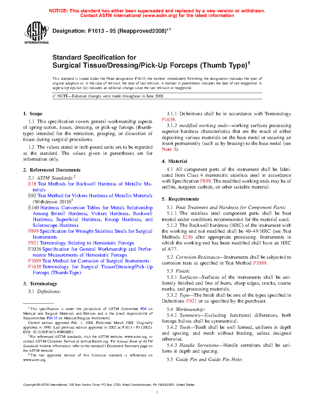 1.1 This specification covers general workmanship aspects of spring-action, tissue, dressing, or pick-up forceps (thumb-type) intended for the retraction, grasping, or dissection of tissue during surgical procedures.