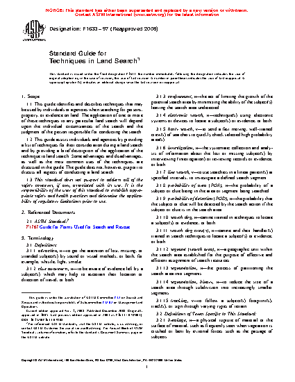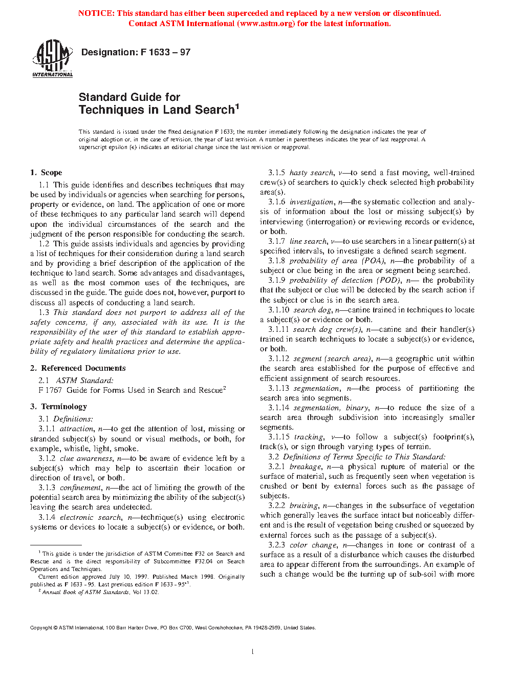 1.1 This guide identifies and describes techniques that may be used by individuals or agencies when searching for persons, property, or evidence on land. The application of one or more of these techniques to any particular land search will depend upon the individual circumstances of the search and the judgment of the person responsible for conducting the search.