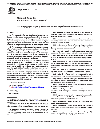 1.2 This guide assists individuals and agencies by providing a list of techniques for their consideration during a land search and by providing a brief description of the application of the technique to land search. Some advantages and disadvantages, as well as the most common uses of the techniques, are discussed in the guide. The guide does not, however, purport to discuss all aspects of conducting a land search.