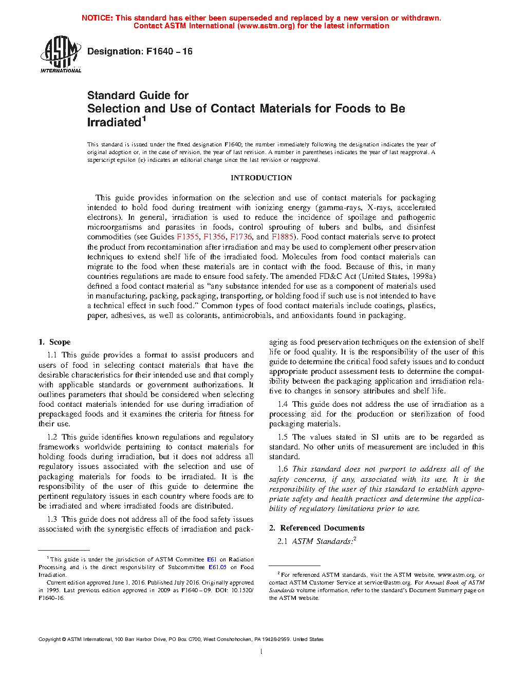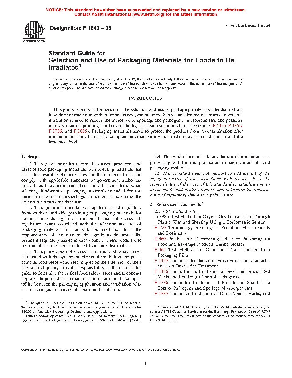1.1 This guide outlines parameters that should be considered when selecting food-contact packaging materials intended for use during the irradiation of prepackaged foods.