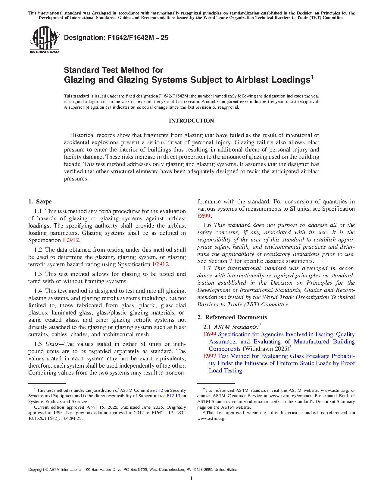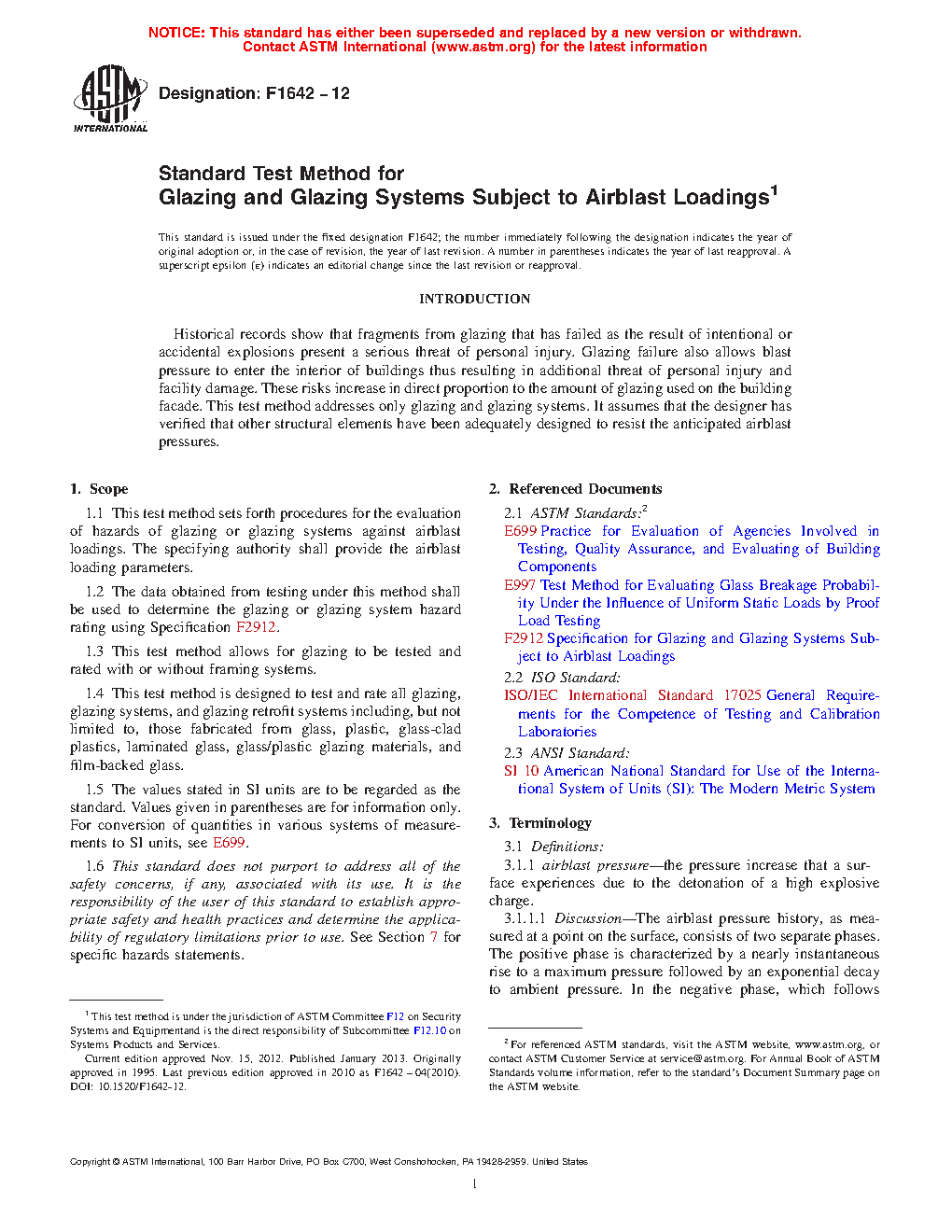 1.1 This test method sets forth procedures for the evaluation of hazards of glazing or glazing systems against airblast loadings. The specifying authority shall provide the airblast loading parameters. Glazing systems shall be as defined in Specification F2912.