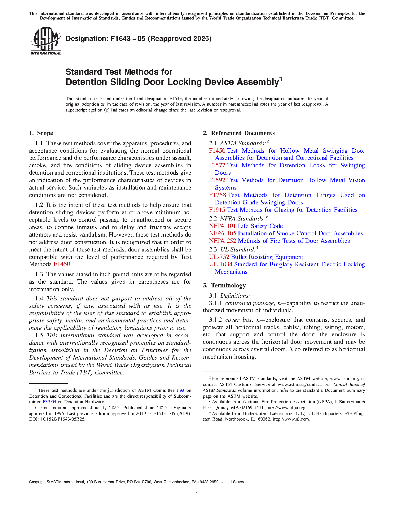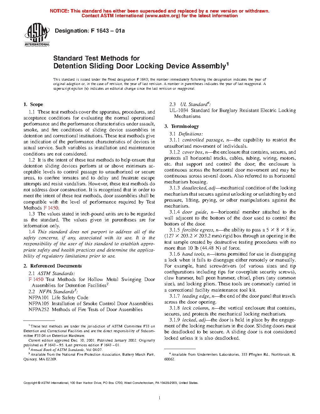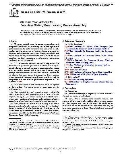 1.2 It is the intent of these test methods to help ensure that detention sliding devices perform at or above minimum acceptable levels to control passage to unauthorized or secure areas, to confine inmates and to delay and frustrate escape attempts and resist vandalism. However, these test methods do not address door construction. It is recognized that in order to meet the intent of these test methods, door assemblies shall be compatible with the level of performance required by Test Methods F1450.