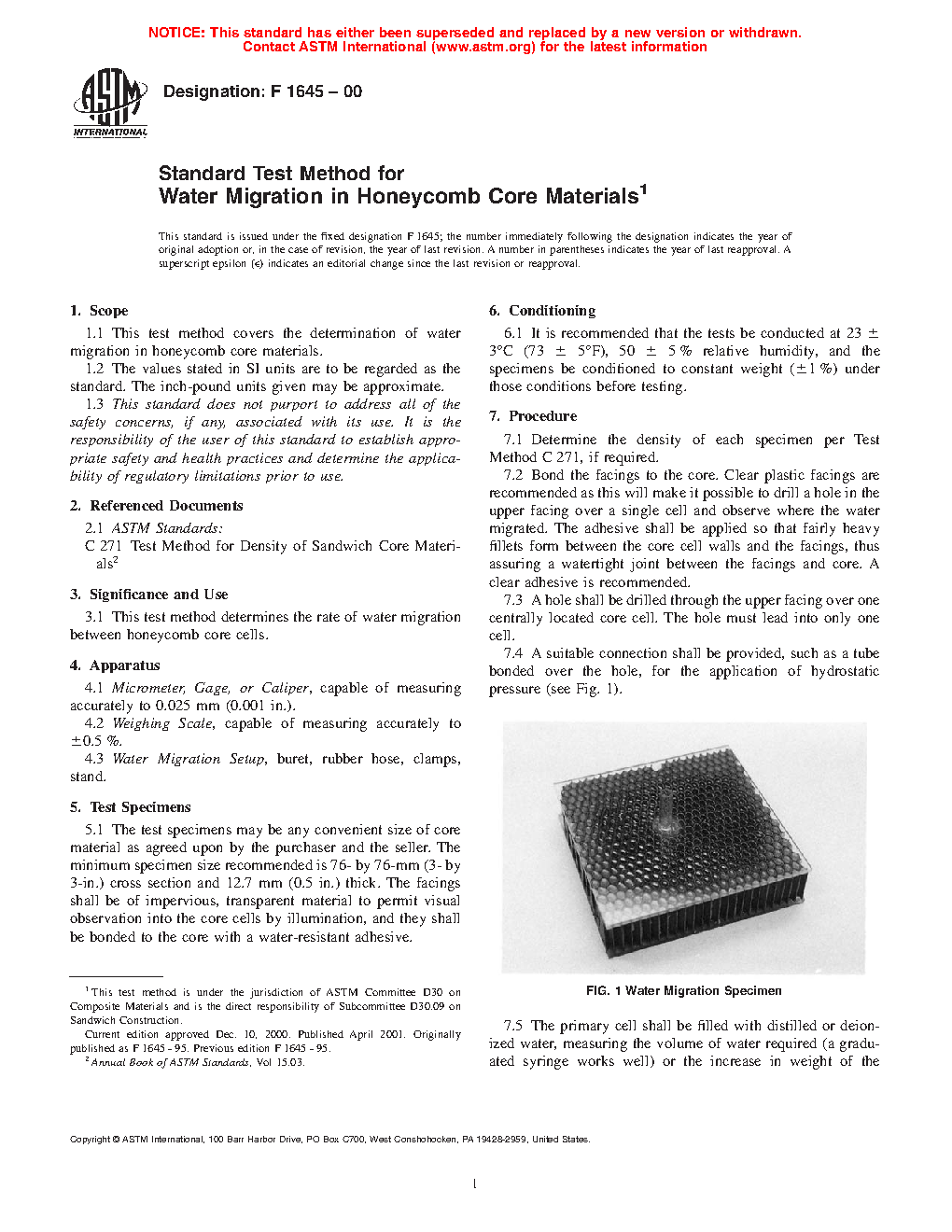 Standard Test Method for Water Migration in Honeycomb Core Materials