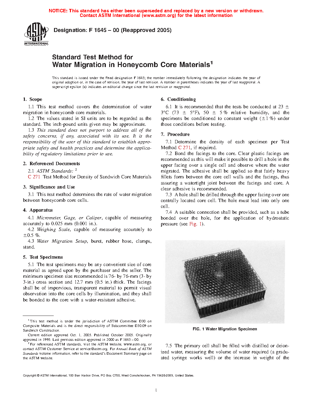 1.1 This test method covers the determination of water migration in honeycomb core materials.