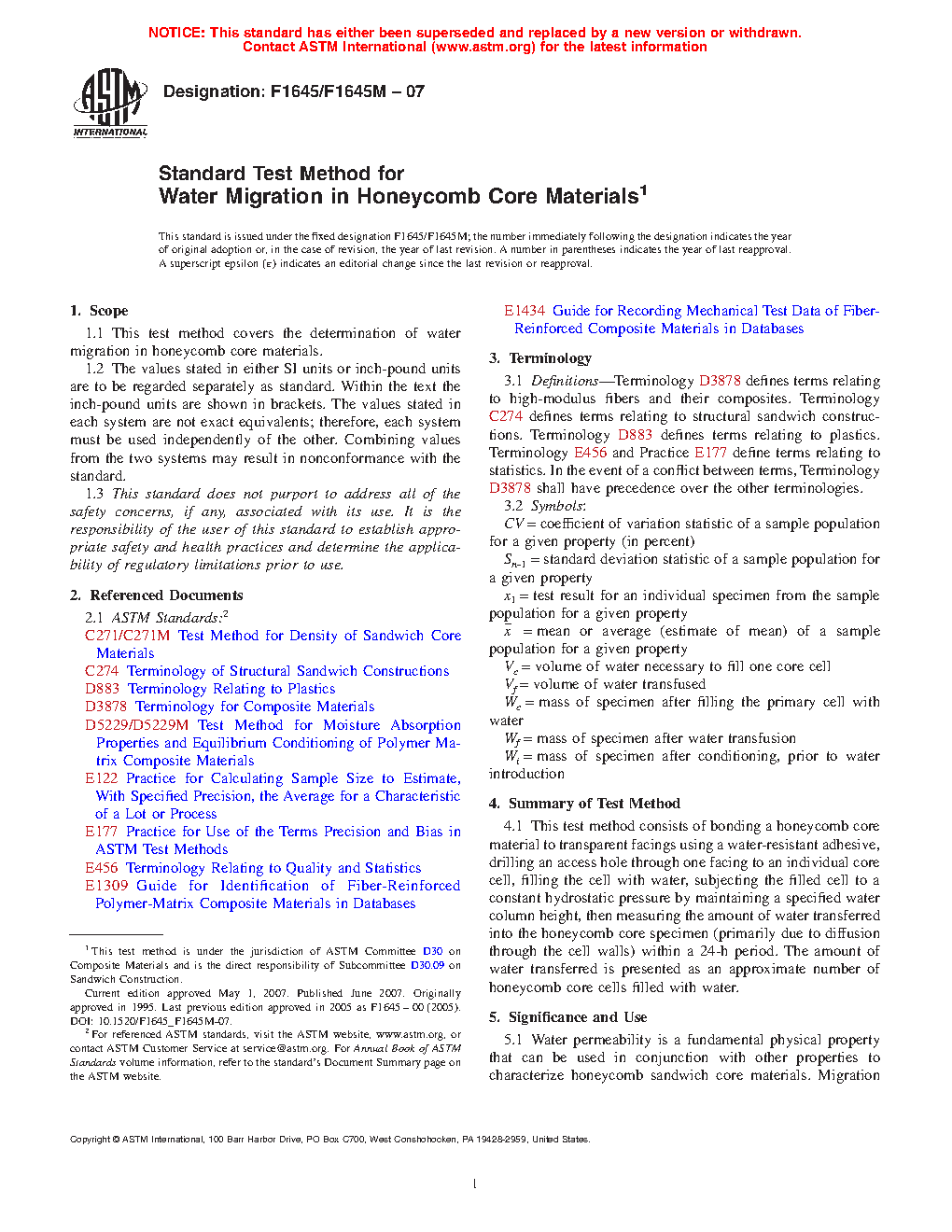5.2 This test method provides a standard method of characterizing the rate of water migration within honeycomb sandwich core materials for design properties, material specifications, research and development applications, and quality assurance.