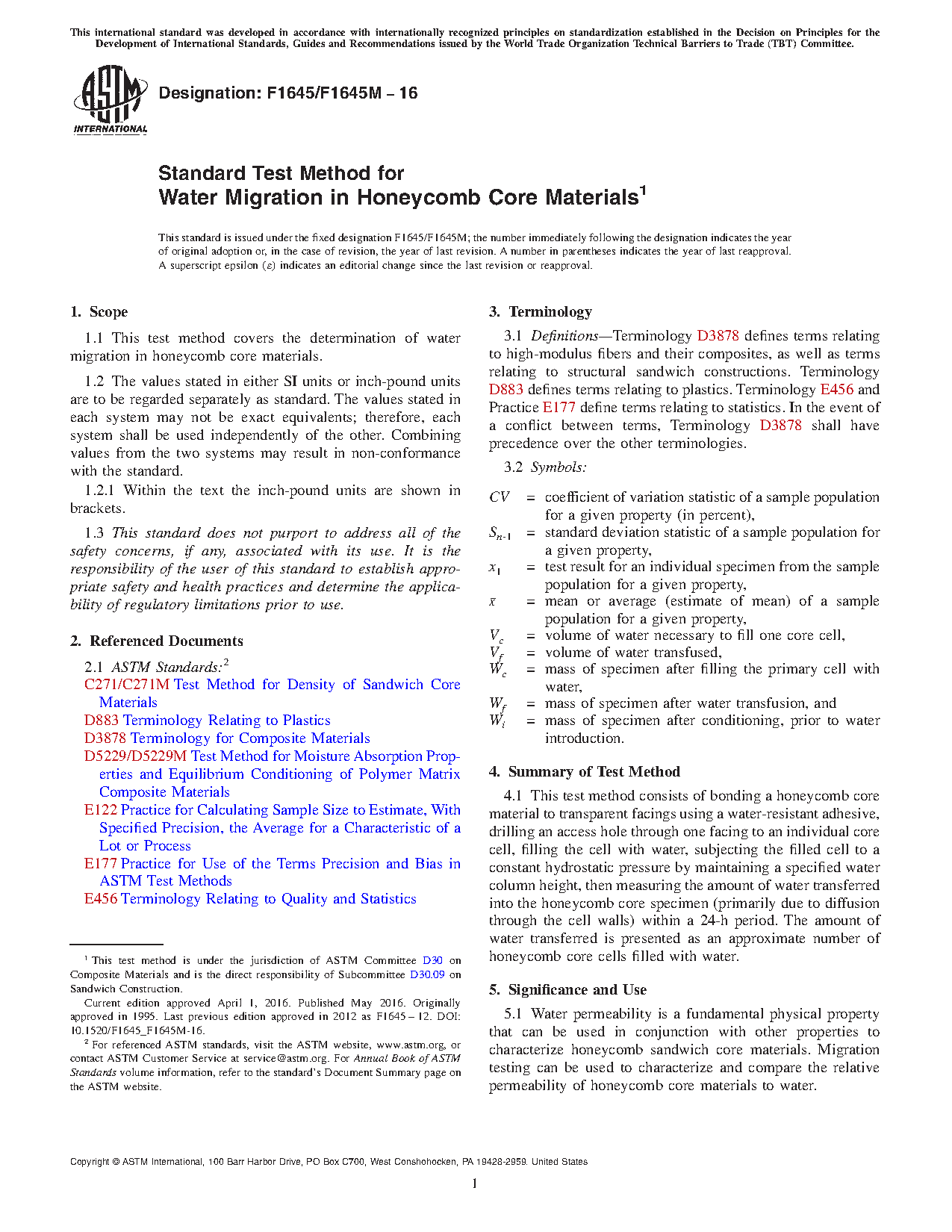 5.3 Factors that influence water migration rate characteristics of honeycomb sandwich core materials and shall therefore be reported include the following: core material, methods of material fabrication, core geometry (cell size), core thickness, core thickness uniformity, cell wall thickness, specimen geometry, specimen preparation, specimen conditioning, facing material, facing permeability, adhesive permeability, adhesive thickness, and methods of mass, volume, and water column height measurement.