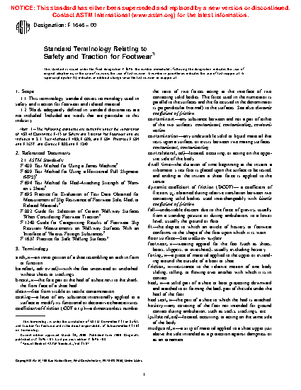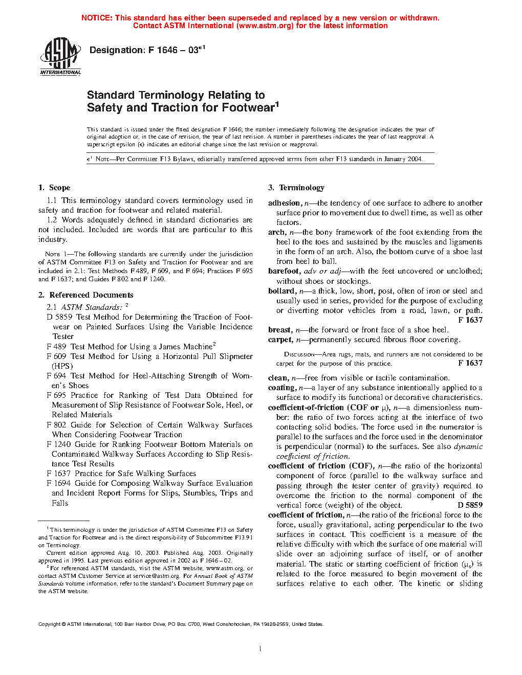 Note 1—The following standards are currently under the jurisdiction of ASTM Committee F13 on Safety and Traction for Footwear and are included in 2.1: Test Methods F489, F609, and F694; Practices F695 and F1637; and Guides F802 and F1240.