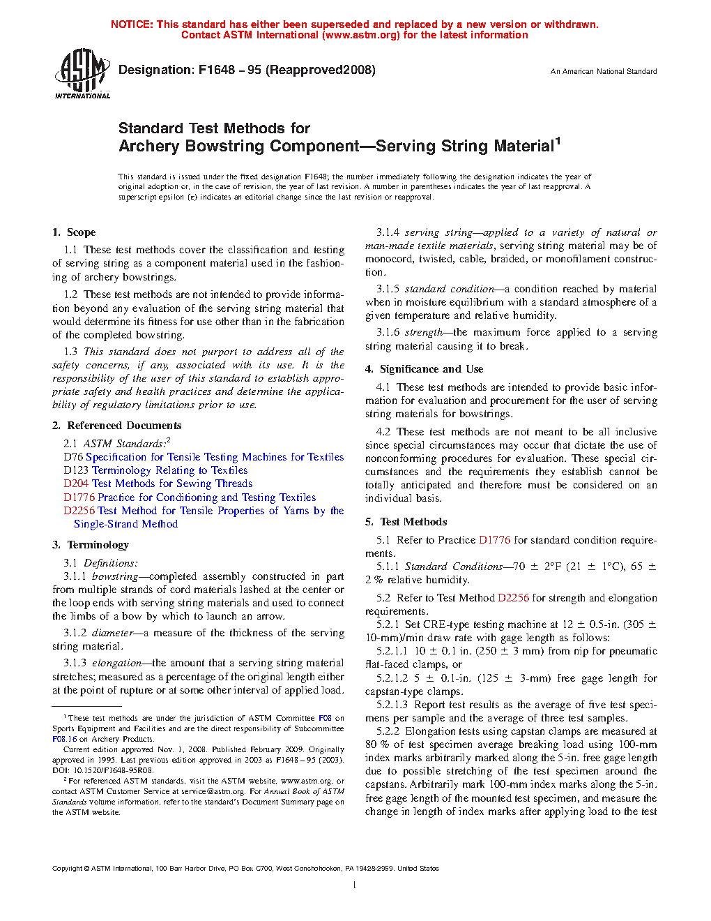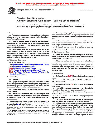 1.2 These test methods are not intended to provide information beyond any evaluation of the serving string material that would determine its fitness for use other than in the fabrication of the completed bowstring.