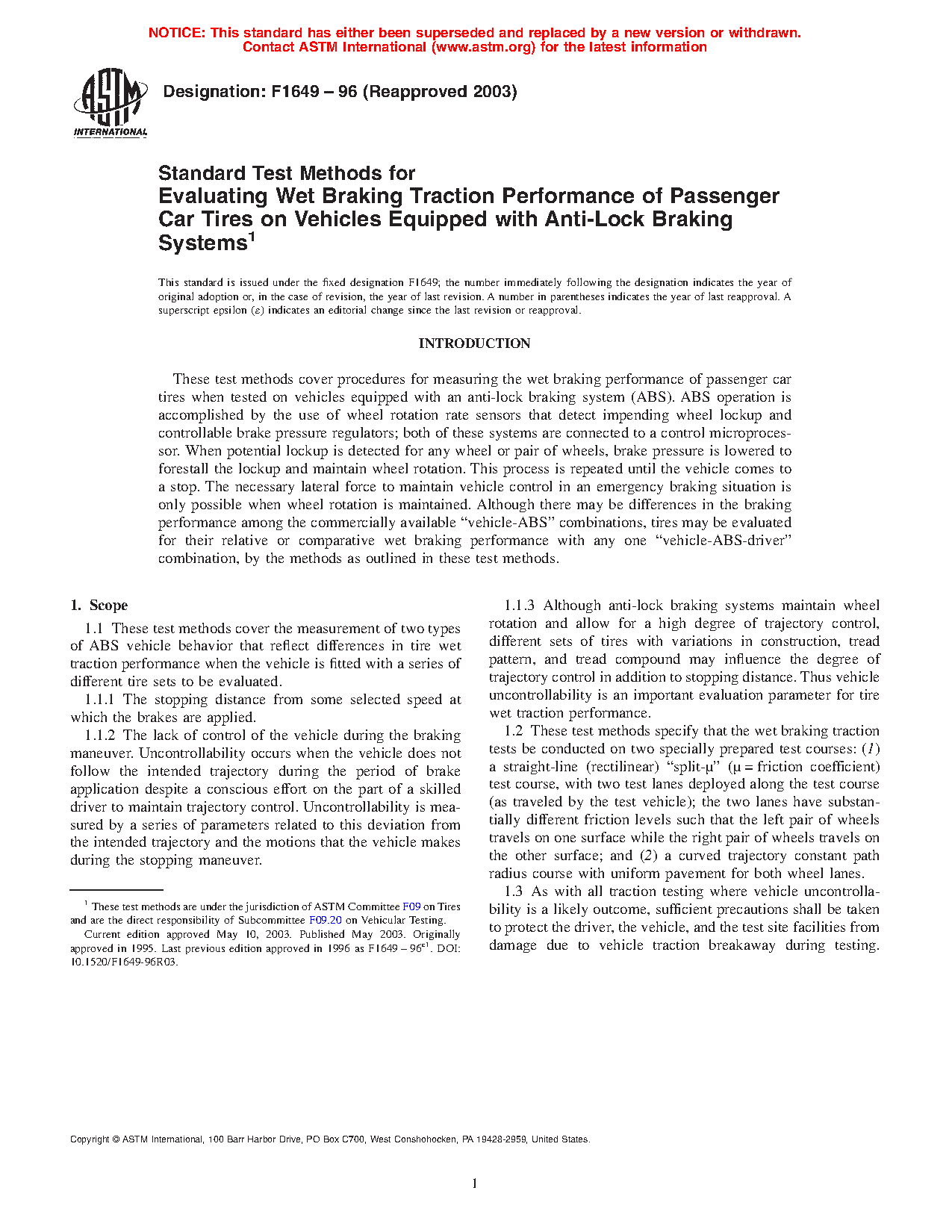 1.1.3 Although anti-lock braking systems maintain wheel rotation and allow for a high degree of trajectory control, different sets of tires with variations in construction, tread pattern, and tread compound may influence the degree of trajectory control in addition to stopping distance. Thus vehicle uncontrollability is an important evaluation parameter for tire wet traction performance.