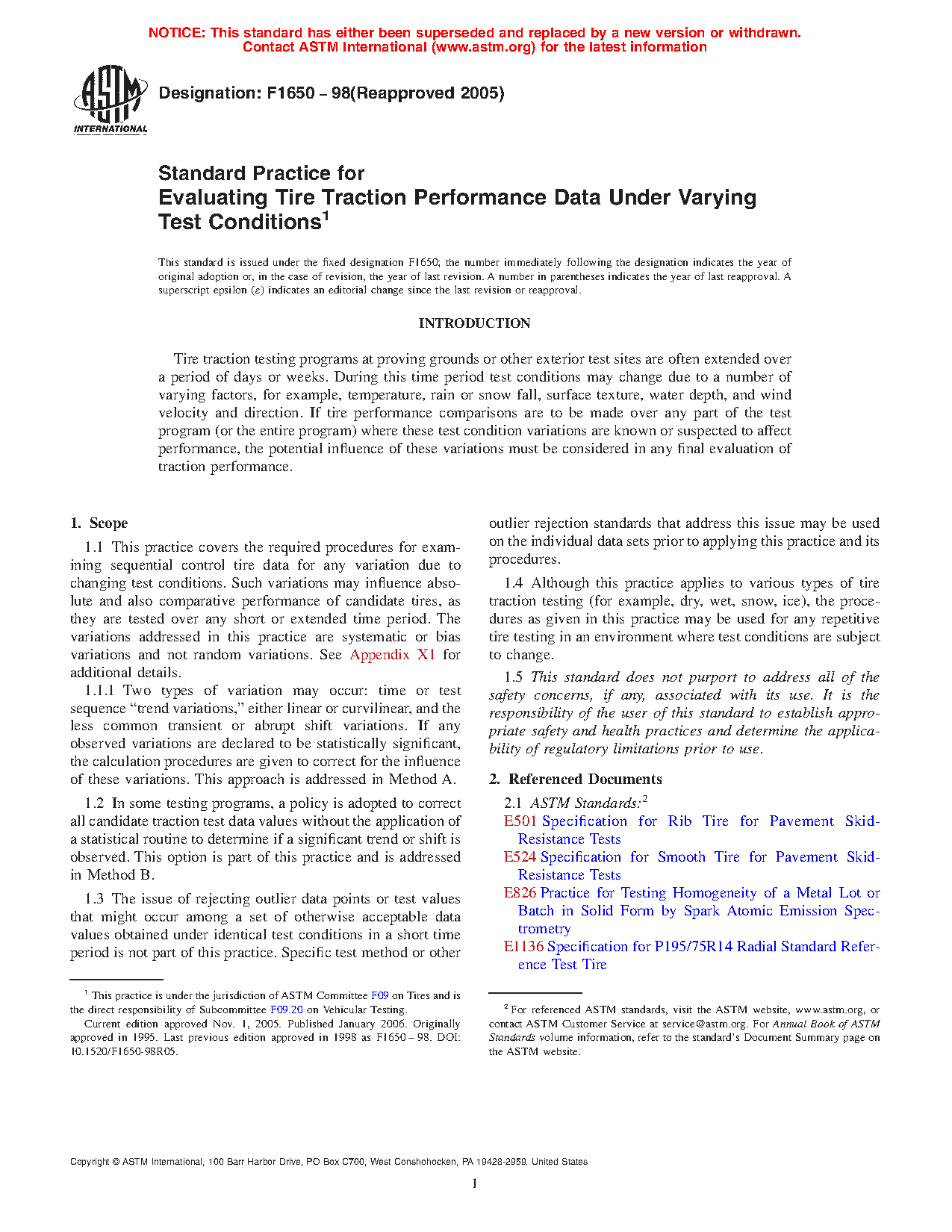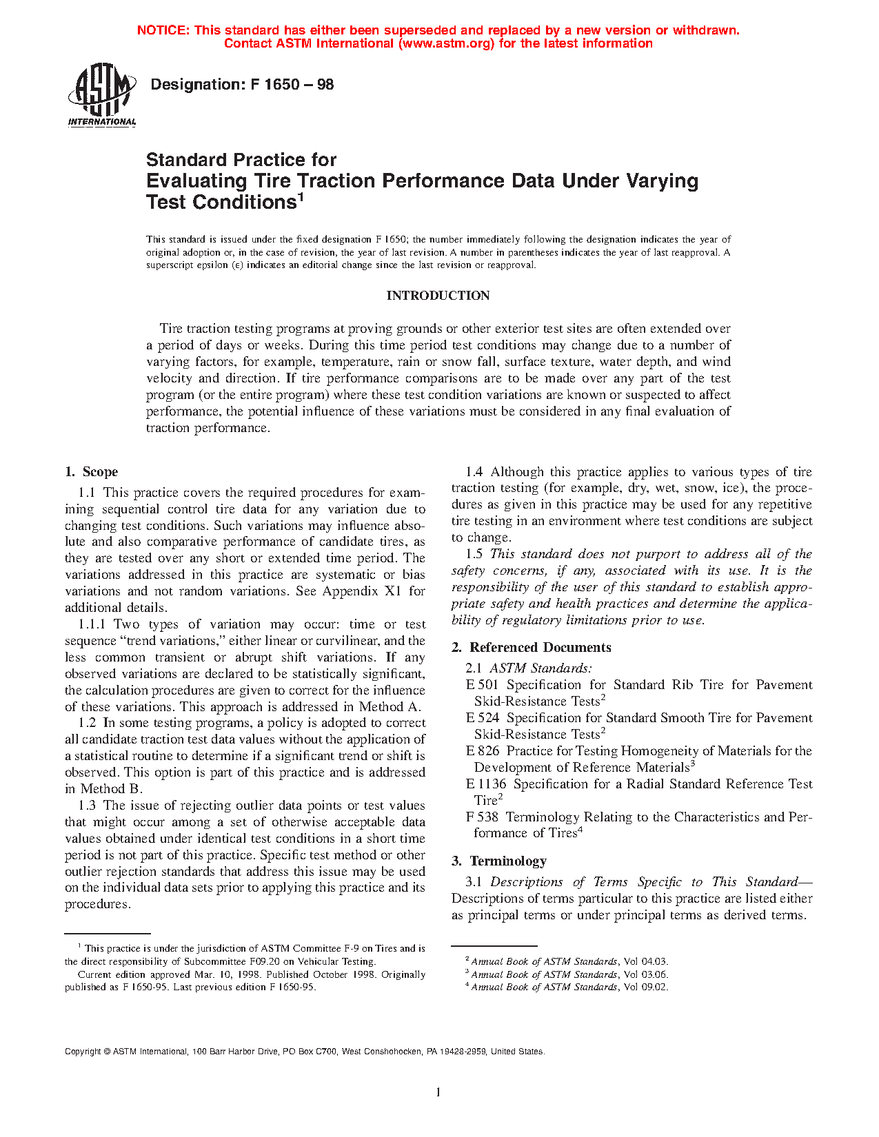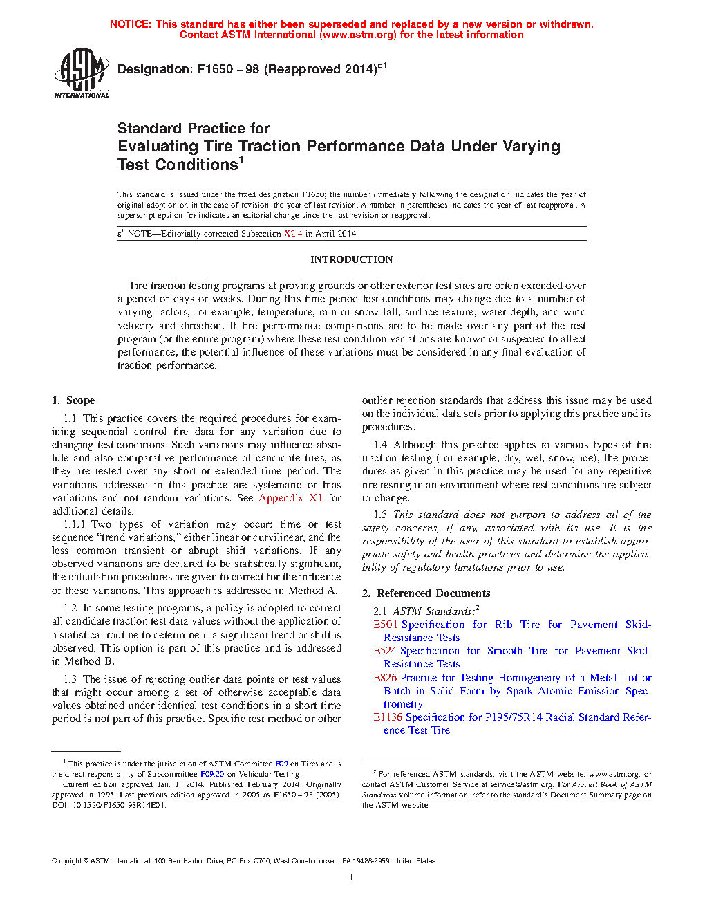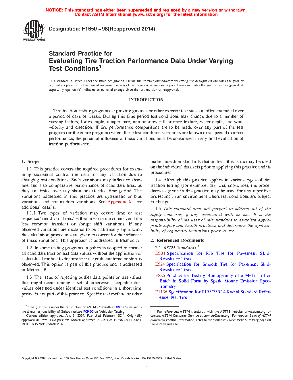 1.4 Although this practice applies to various types of tire traction testing (for example, dry, wet, snow, ice), the procedures as given in this practice may be used for any repetitive tire testing in an environment where test conditions are subject to change.