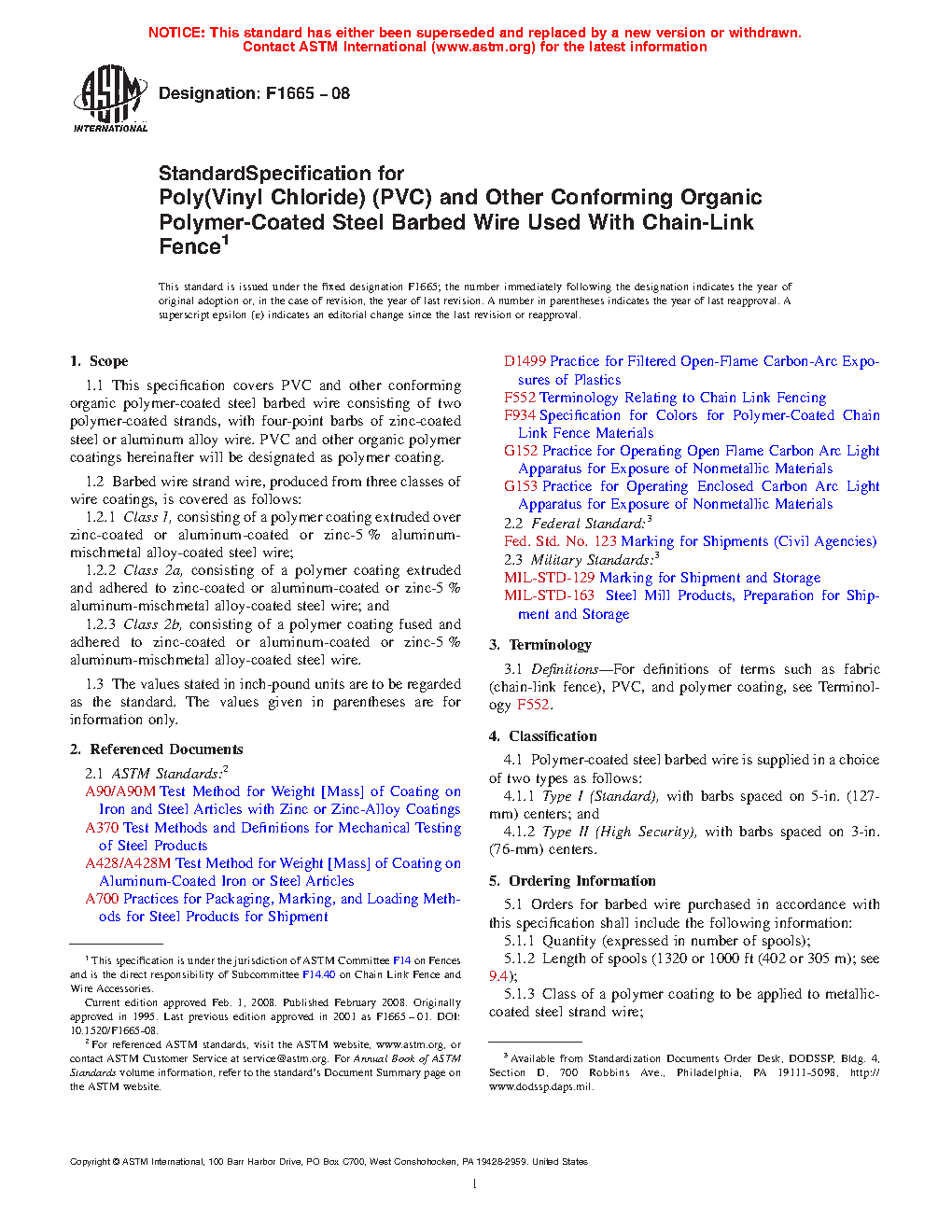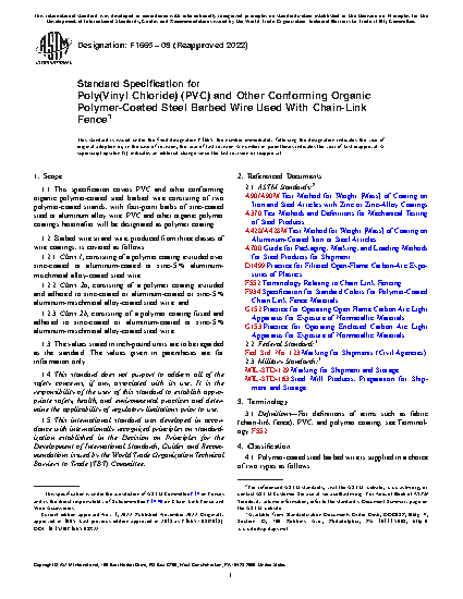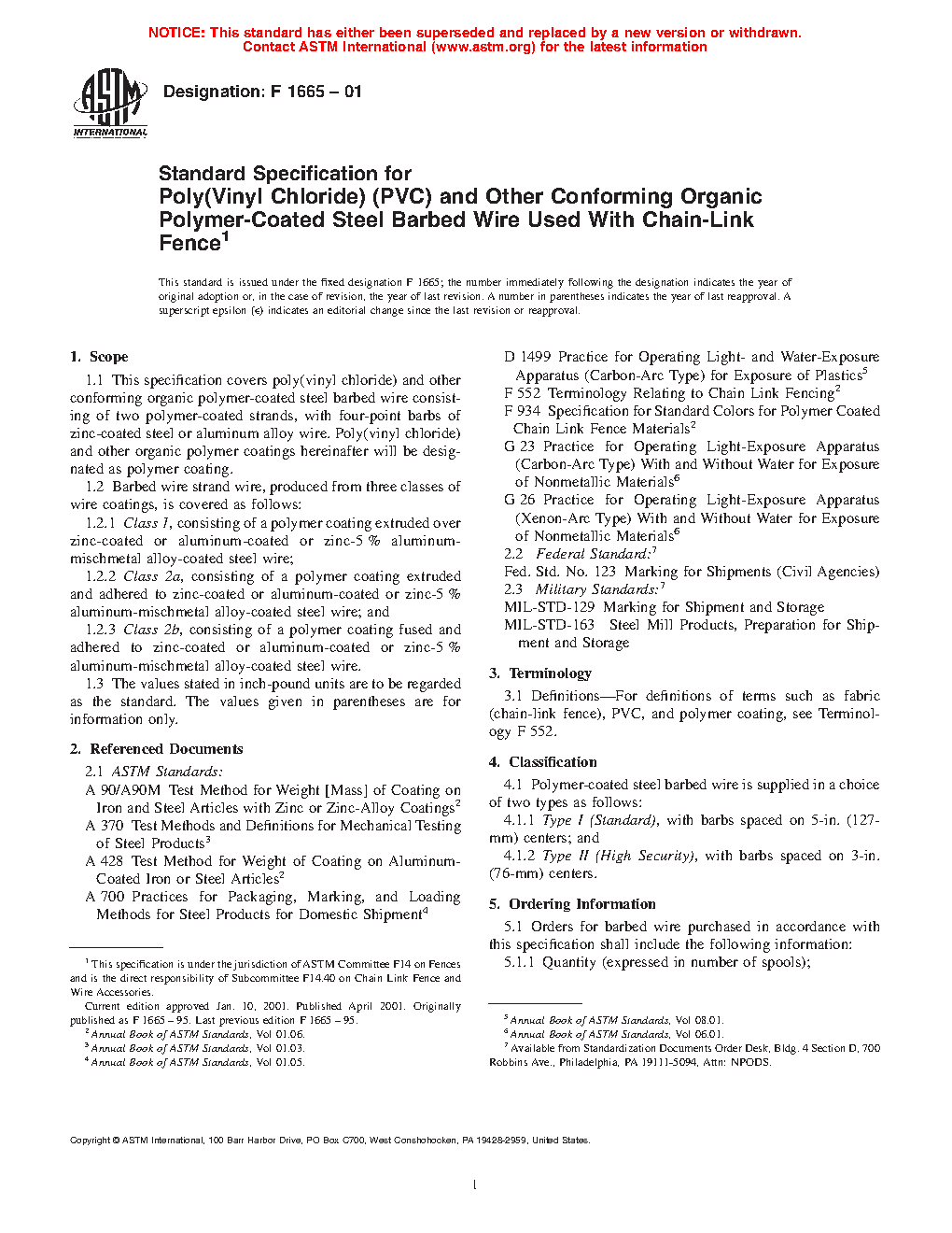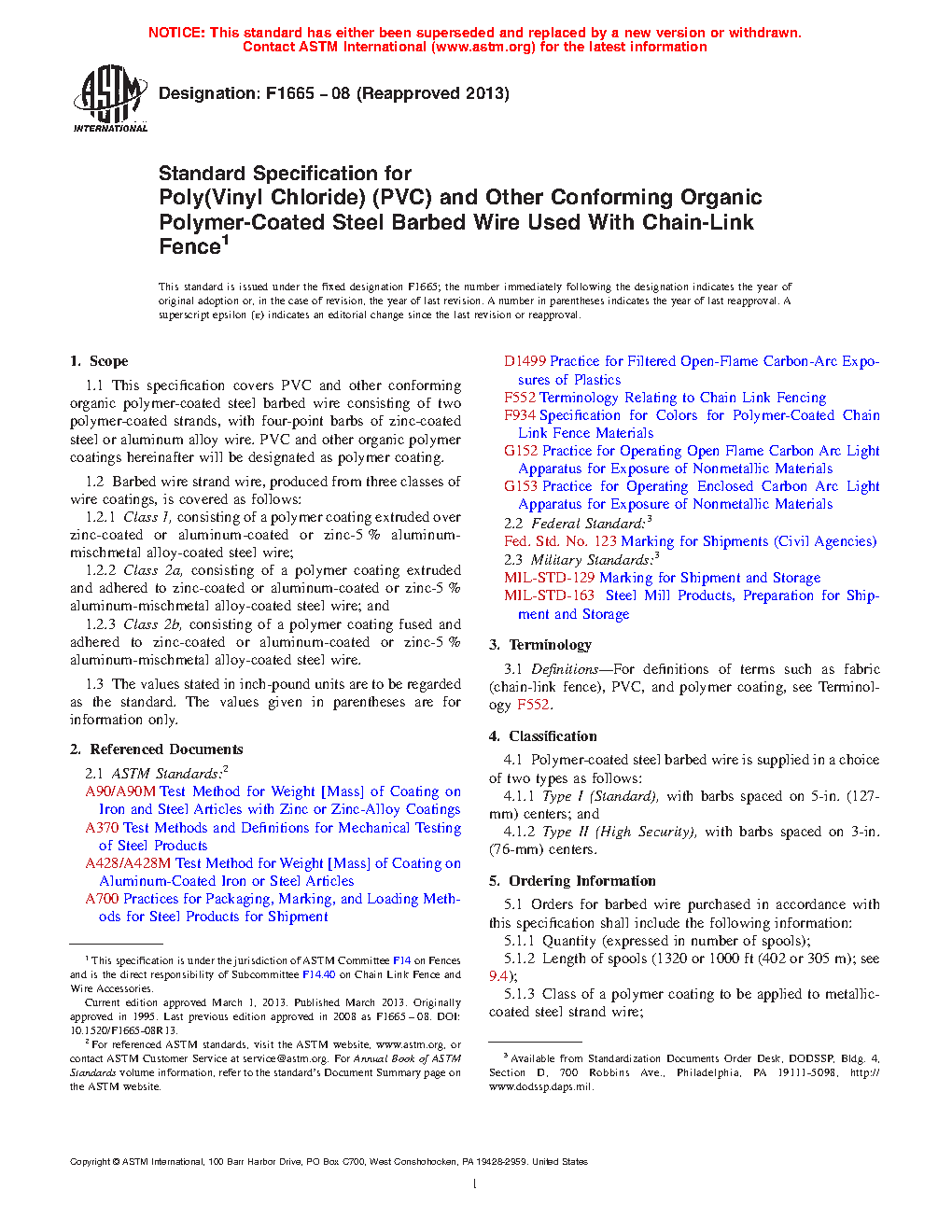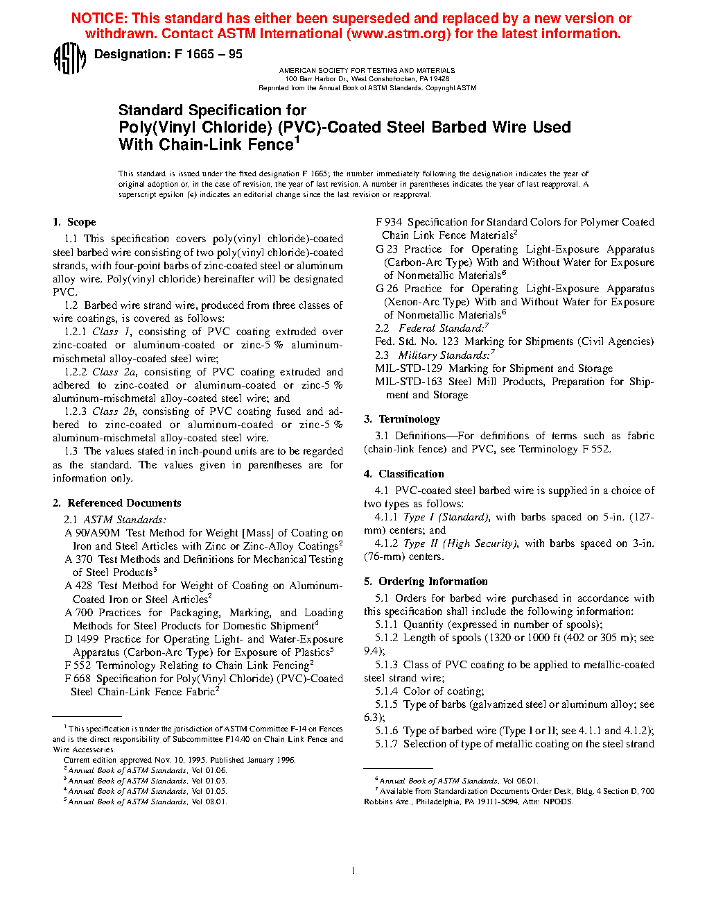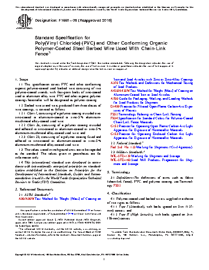 1.1 This specification covers poly(vinyl chloride)-coated steel barbed wire consisting of two poly(vinyl chloride)-coated strands, with four-point barbs of zinc-coated steel or aluminum alloy wire. Poly(vinyl chloride) hereinafter will be designated PVC.