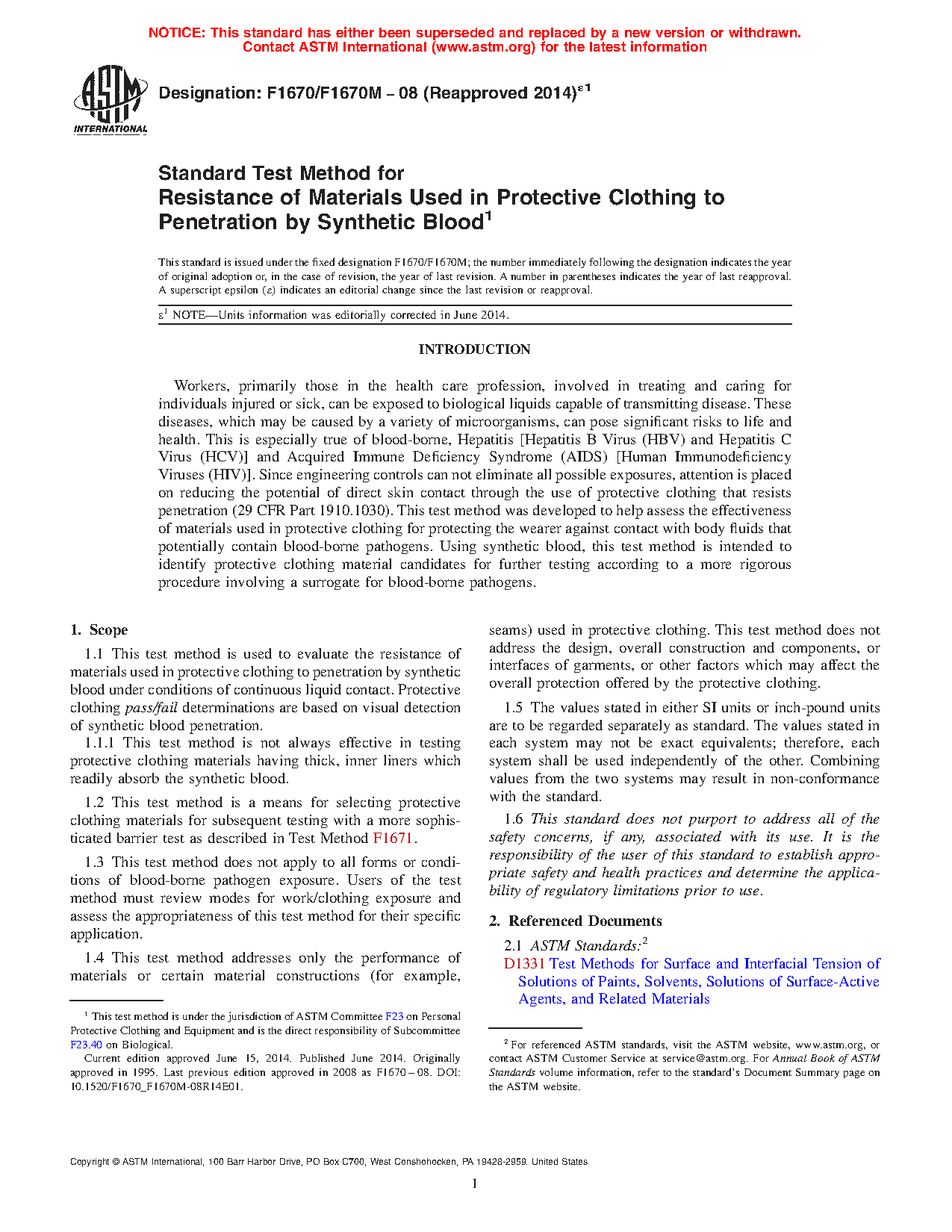 1.3 This test method does not apply to all forms or conditions of blood-borne pathogen exposure. Users of the test method must review modes for work/clothing exposure and assess the appropriateness of this test method for their specific application.