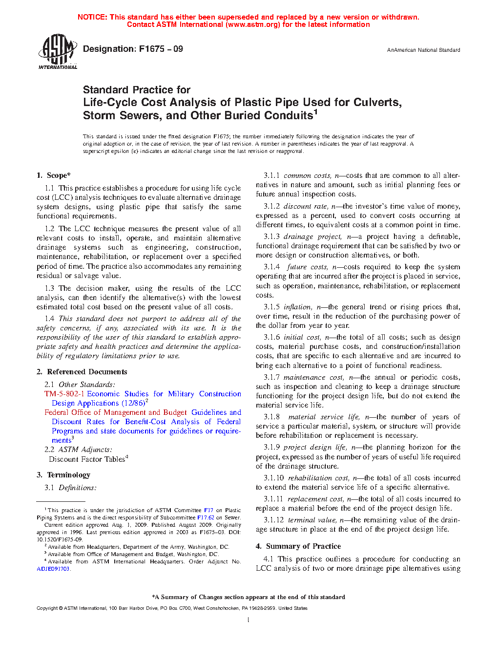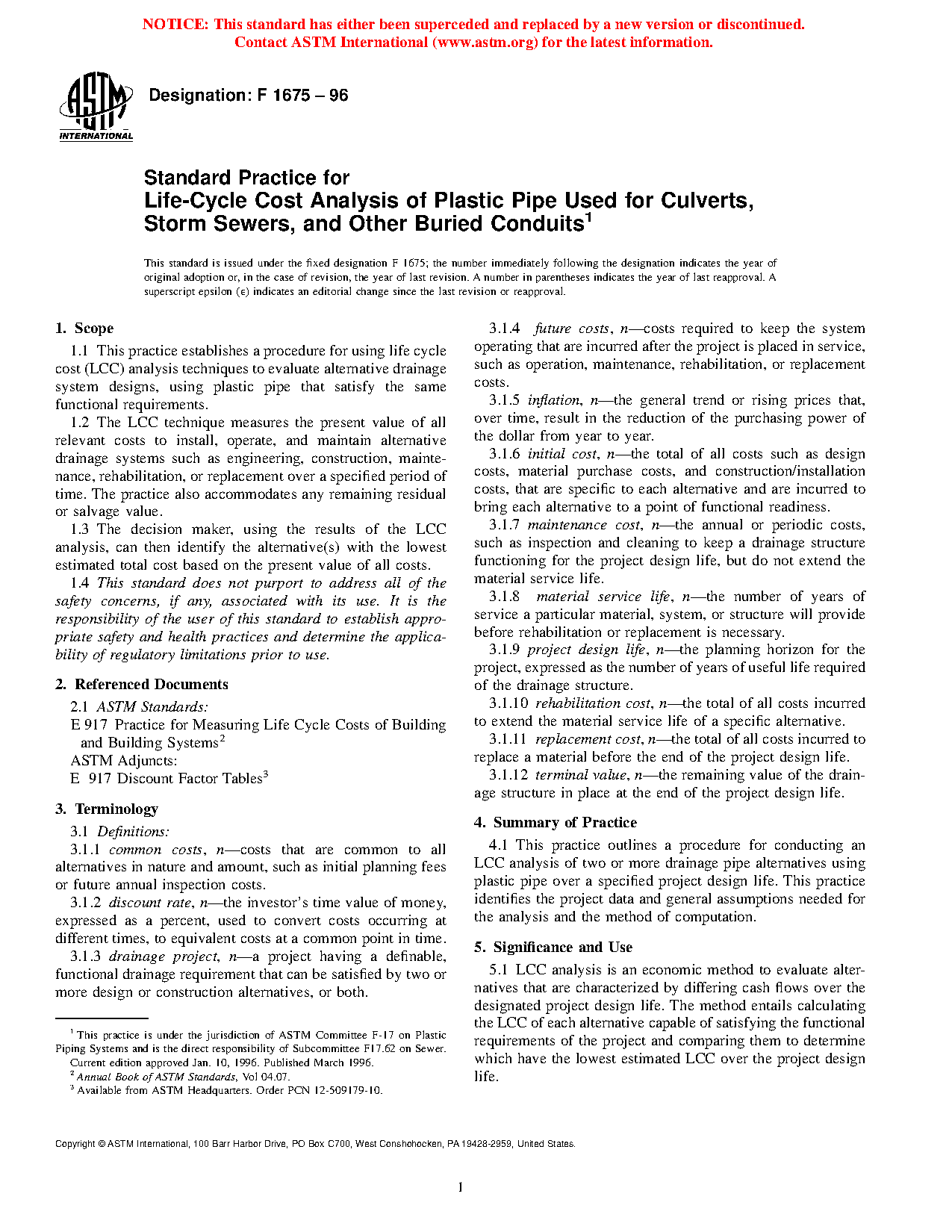 1.1 This practice establishes a procedure for using life cycle cost (LCC) analysis techniques to evaluate alternative drainage system designs, using plastic pipe that satisfy the same functional requirements.
