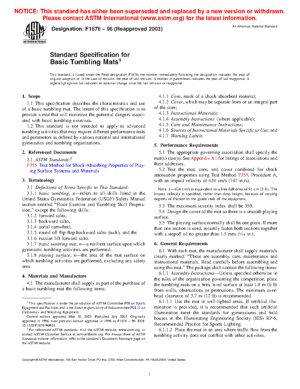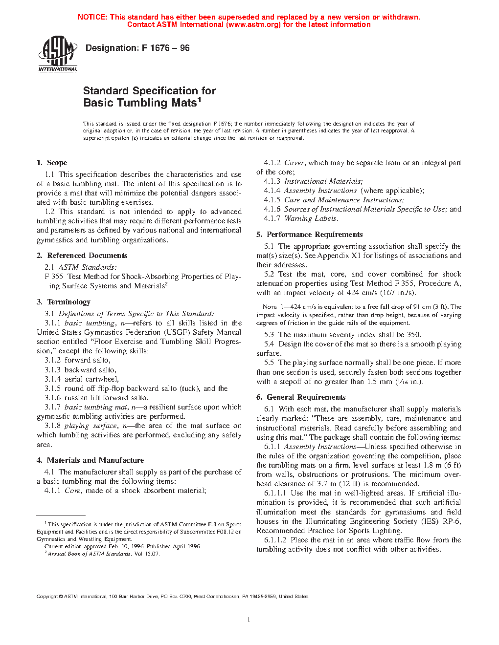 1.1 This specification describes the characteristics and use of a basic tumbling mat. The intent of this specification is to provide a mat that will minimize the potential dangers associated with basic tumbling exercises.