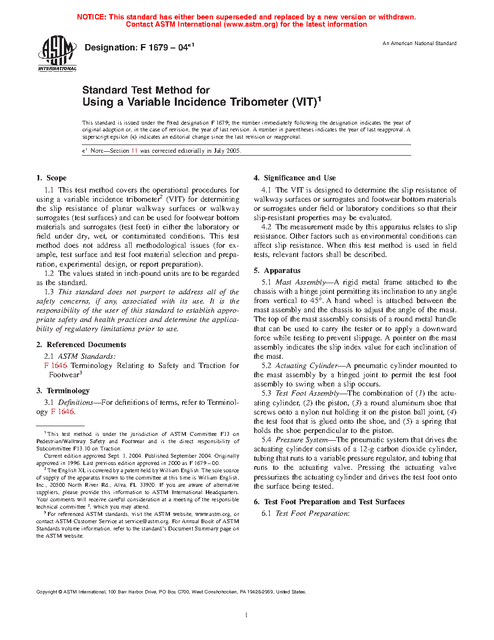 1.1 This test method covers the operational procedures for using a variable incidence tribometer (VIT) for determining the slip resistance of footwear sole, heel, or related materials (test feet) against planar walkway surfaces or walkway surrogates (test surfaces) in either the laboratory or field under dry, wet, or contaminated conditions. This test method does not address all methodological issues (for example, test surface and test foot material selection and preparation, experimental design, or report preparation).