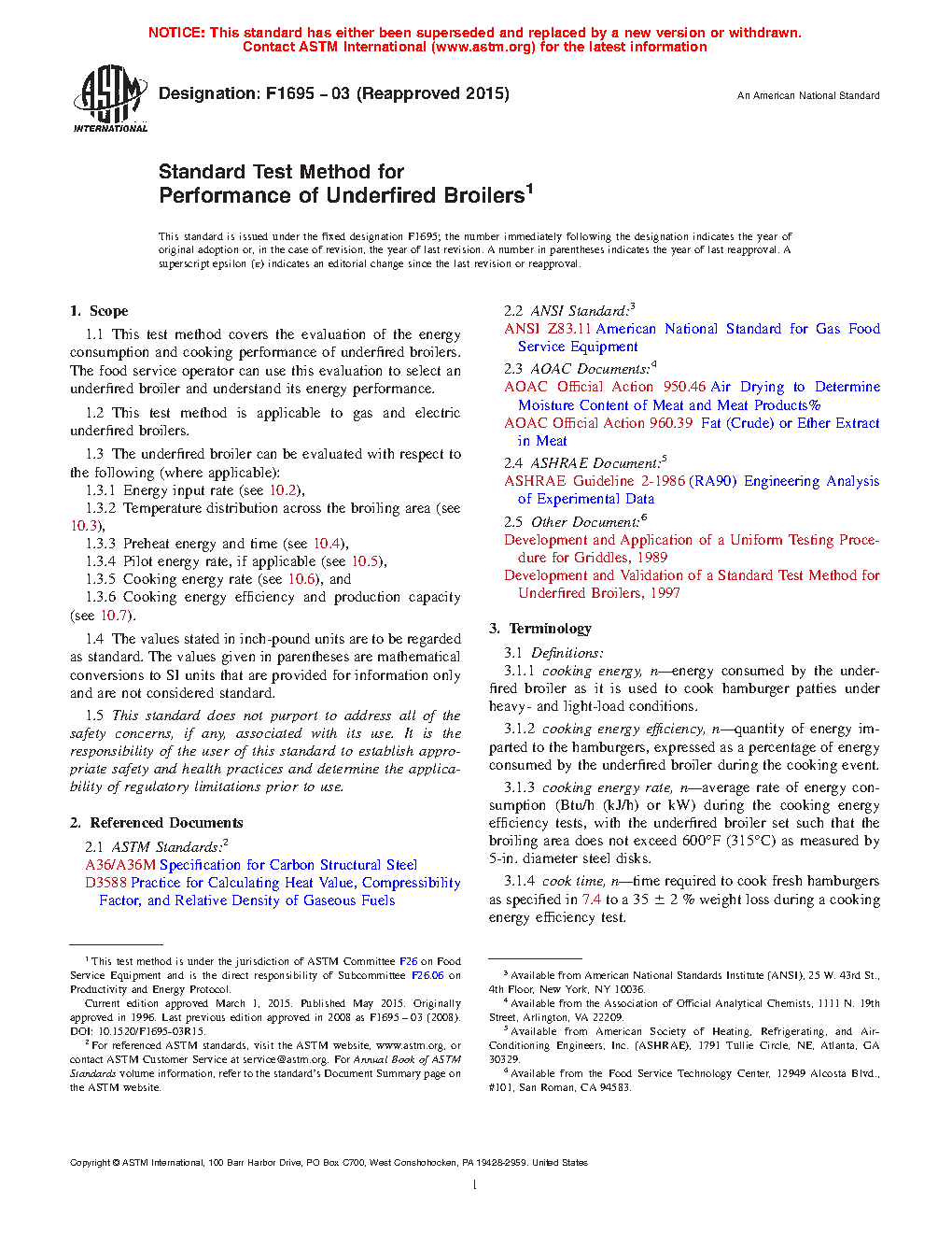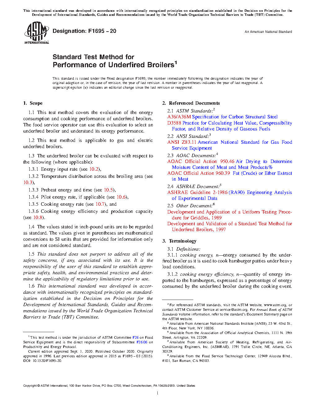 1.1 This test method covers the evaluation of the energy consumption and cooking performance of underfired broilers. The food service operator can use this evaluation to select an underfired broiler and understand its energy performance.