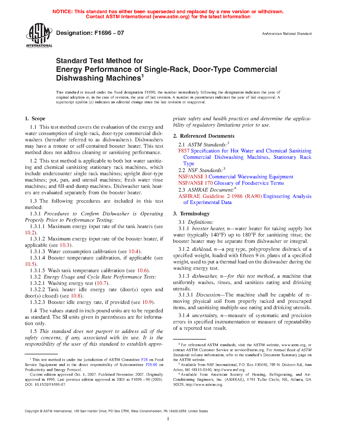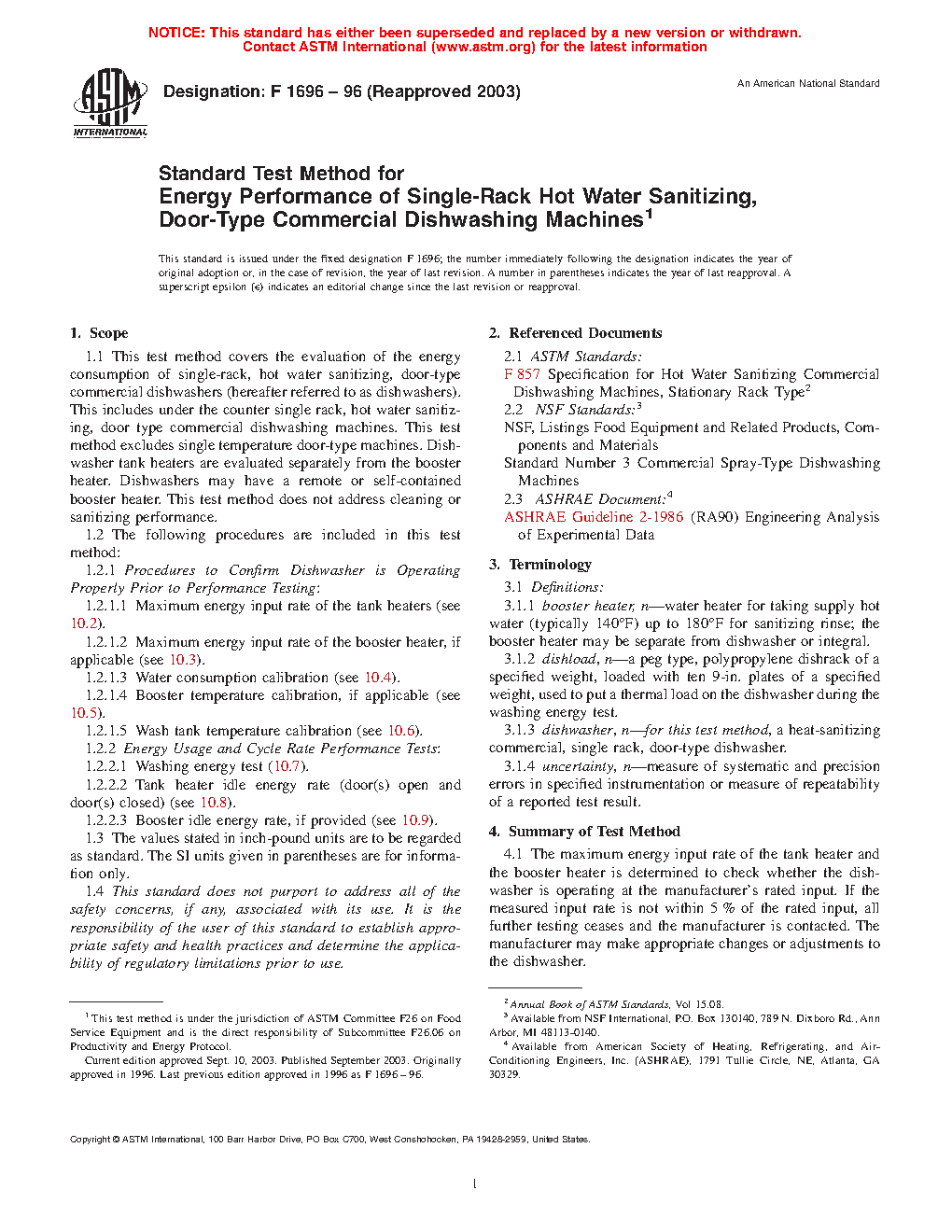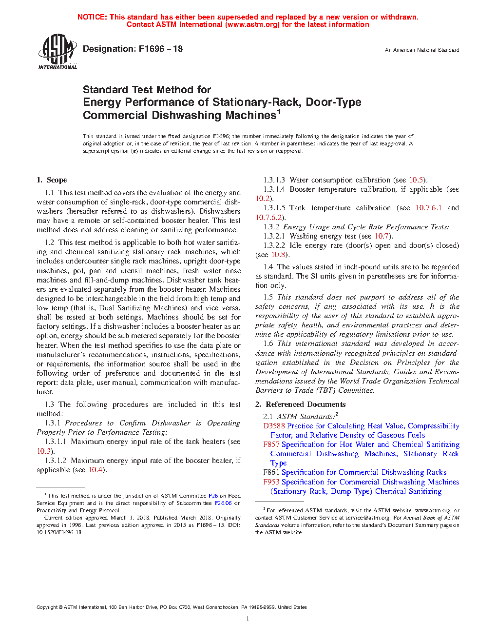 1.1 This test method covers the evaluation of the energy consumption of single-rack, hot water sanitizing, door-type commercial dishwashers (hereafter referred to as dishwashers). This includes under the counter single rack, hot water sanitizing, door type commerical dishwashing machines. This test method excludes single temperature door-type machines. Dishwasher tank heaters are evaluated separately from the booster heater. Dishwashers may have a remote or self-contained booster heater. This test method does not address cleaning and sanitizing performance.