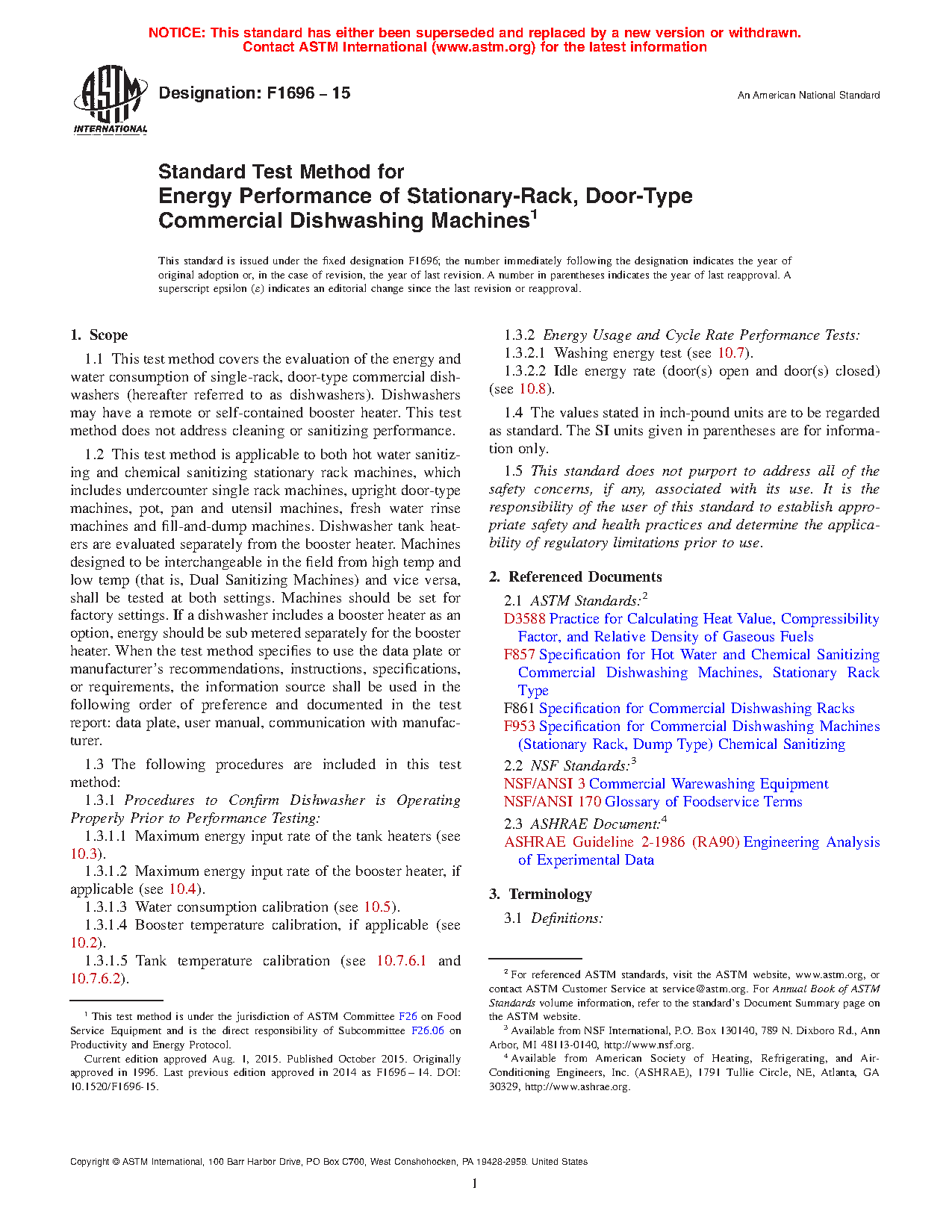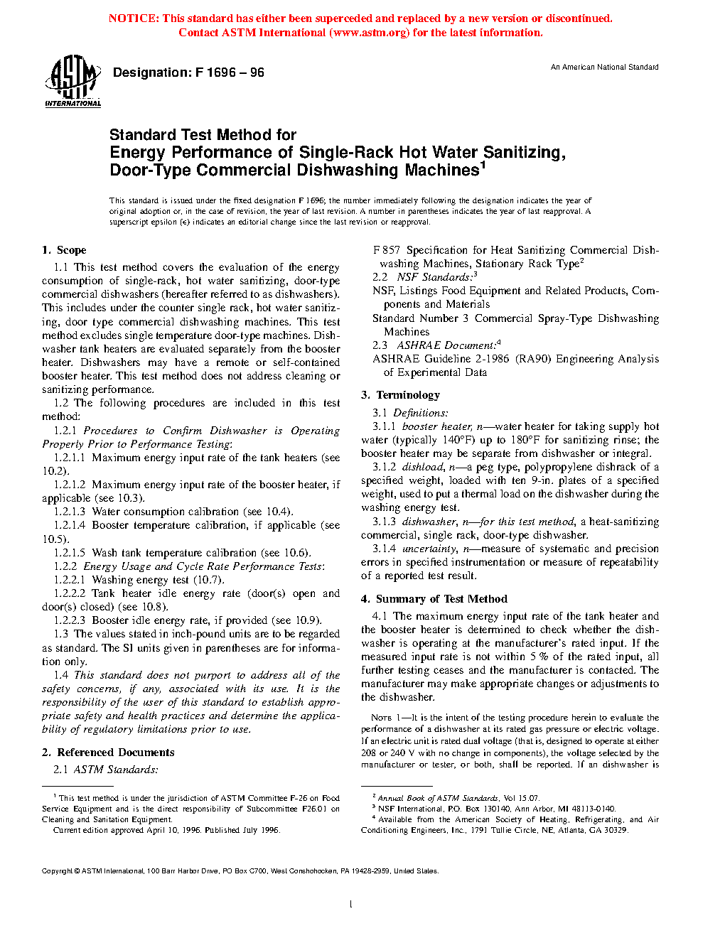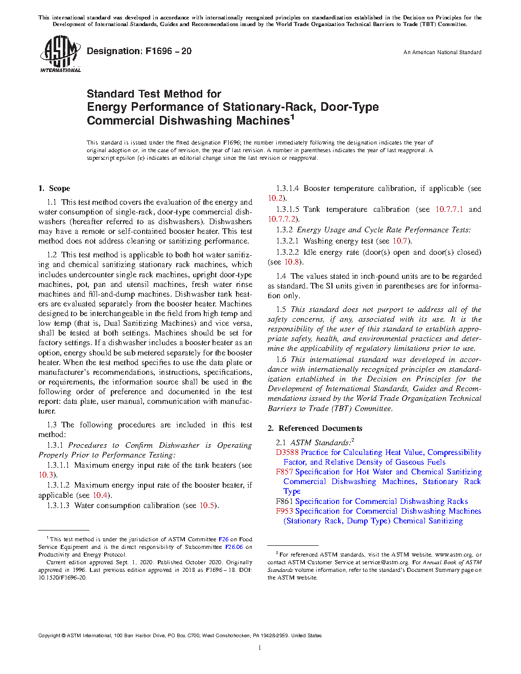 1.1 This test method covers the evaluation of the energy consumption of single-rack, hot water sanitizing, door-type commercial dishwashers (hereafter referred to as dishwashers). This includes under the counter single rack, hot water sanitizing, door type commerical dishwashing machines. This test method excludes single temperature door-type machines. Dishwasher tank heaters are evaluated separately from the booster heater. Dishwashers may have a remote or self-contained booster heater. This test method does not address cleaning and sanitizing performance.