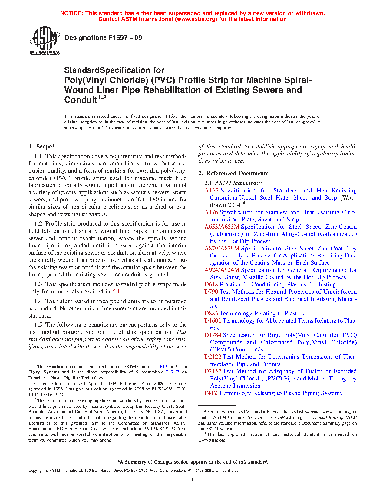 1.2 Profile strip produced to this specification is for use in field fabrication of spirally wound liner pipes in nonpressure sewer and conduit rehabilitation, where the spirally wound liner pipe is expanded until it presses against the interior surface of the existing sewer or conduit, or, alternatively, where the spirally wound liner pipe is inserted as a fixed diameter into the existing sewer or conduit and the annular space between the liner pipe and the existing sewer or conduit is grouted.