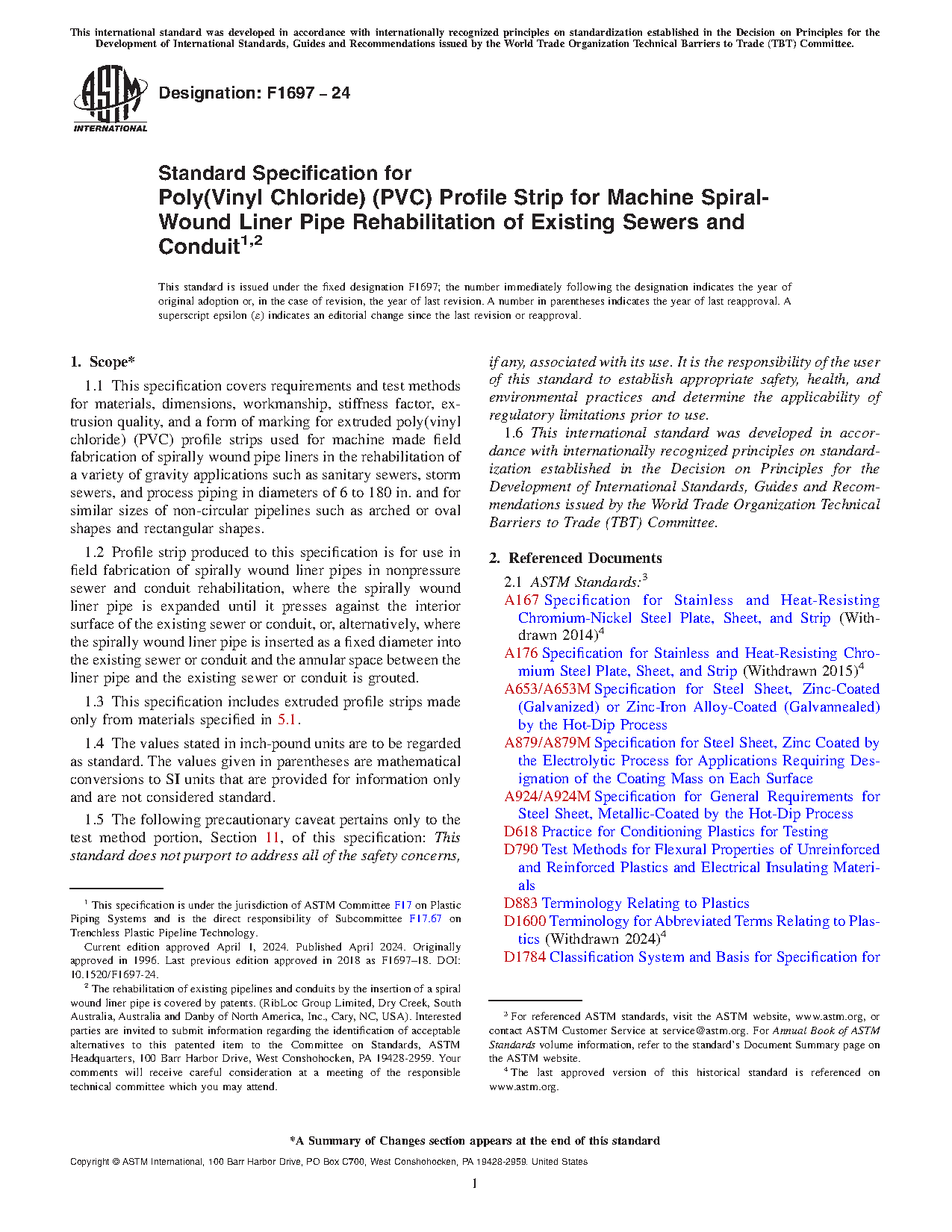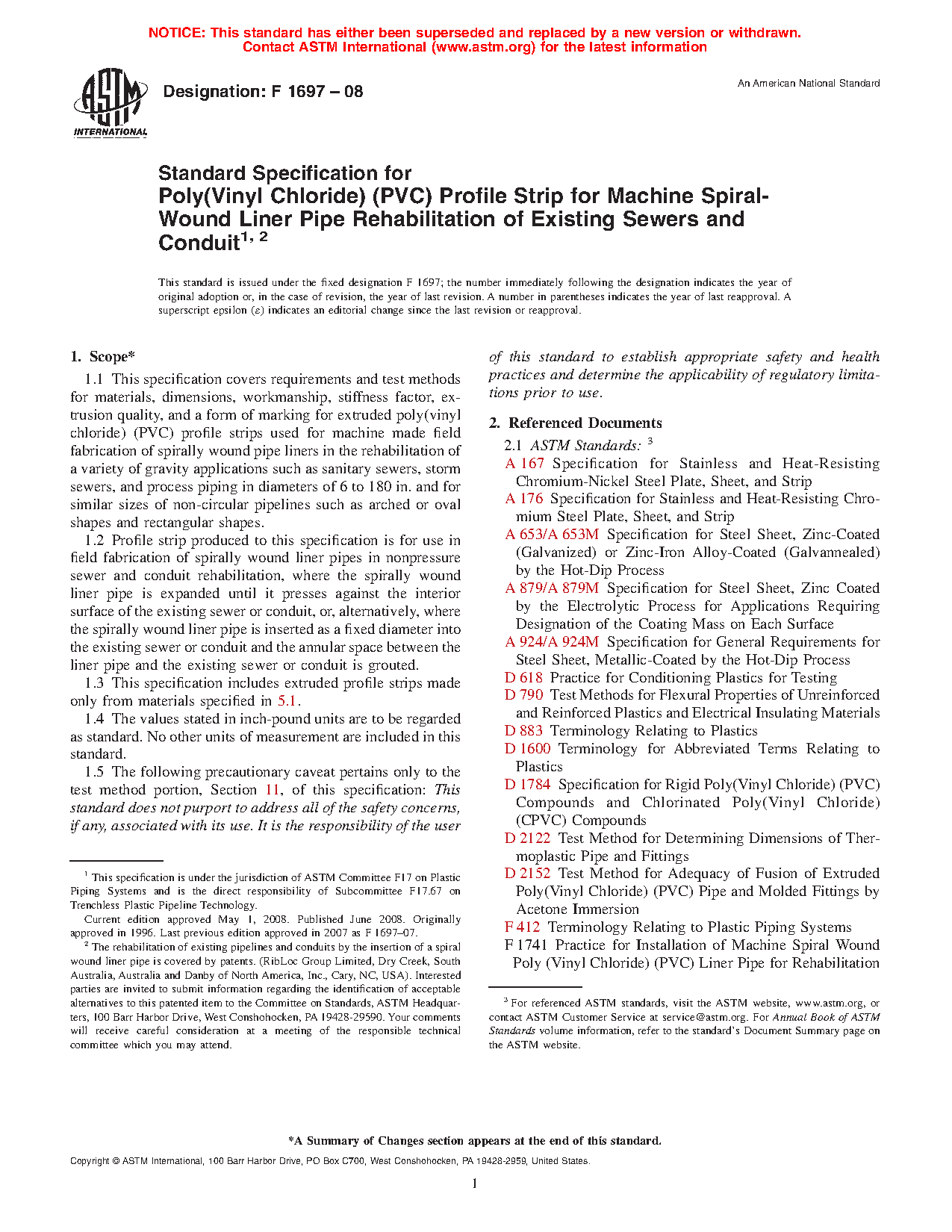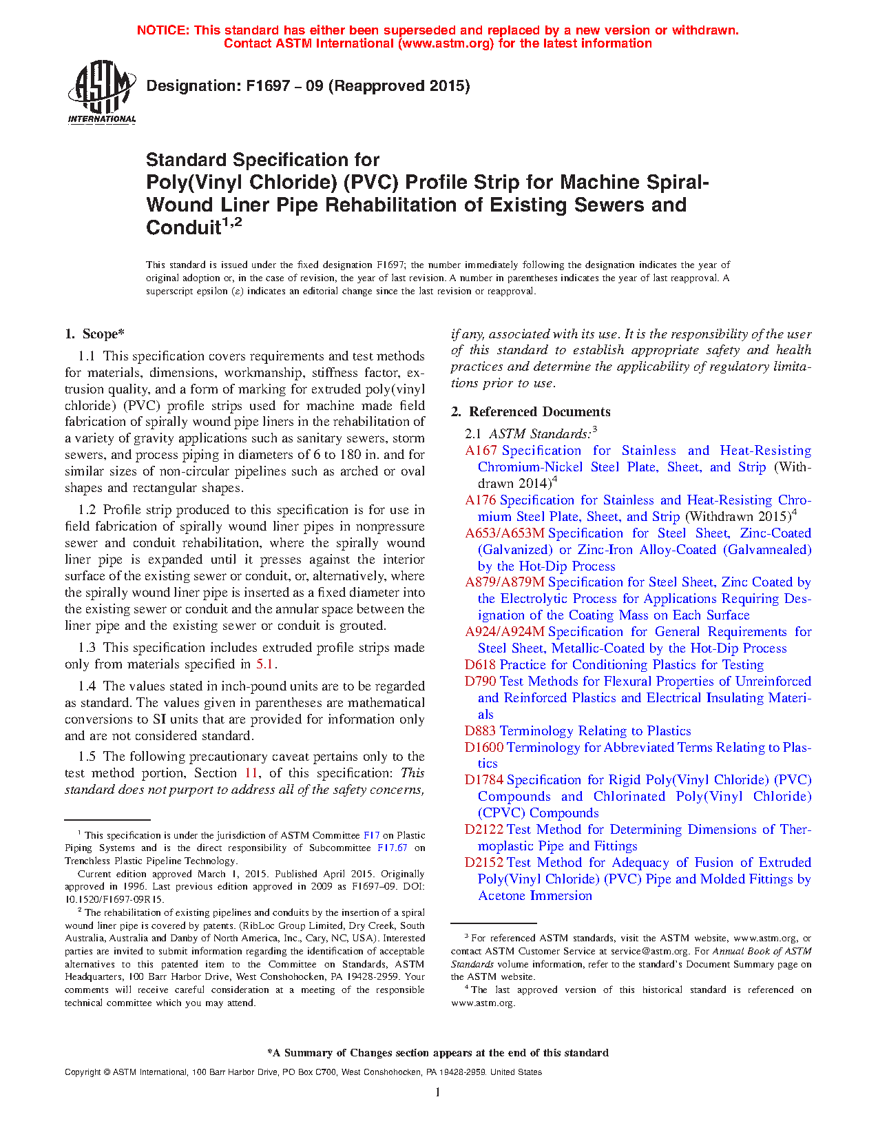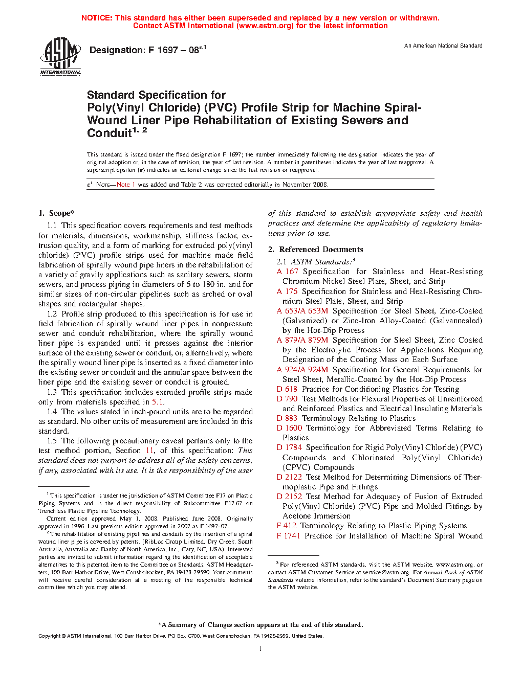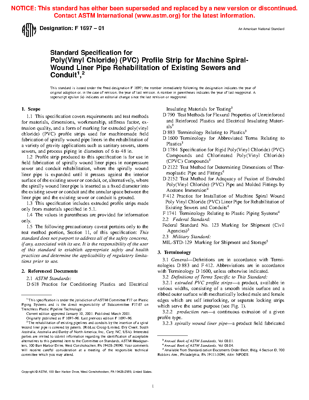 1.2 Profile strip produced to this specification is for use in field fabrication of spirally wound liner pipes in nonpressure sewer and conduit rehabilitation, where the spirally wound liner pipe is expanded until it presses against the interior surface of the existing sewer or conduit, or, alternatively, where the spirally wound liner pipe is inserted as a fixed diameter into the existing sewer or conduit and the annular space between the liner pipe and the existing sewer or conduit is grouted.