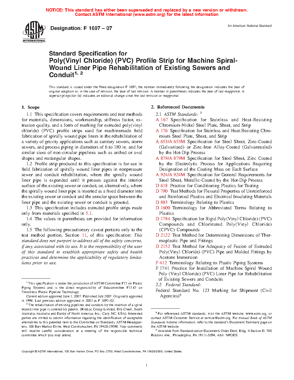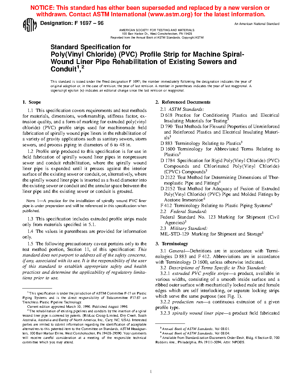 1.1 This specification covers requirements and test methods for materials, dimensions, workmanship, stiffness factor, extrusion quality, and a form of marking for extruded poly(vinyl chloride) (PVC) profile strips used for machinemade field fabrication of spirally wound pipe liners in the rehabilitation of a variety of gravity applications such as sanitary sewers, storm sewers, and process piping in diameters of 6 to 180 in. and for similar sizes of non-circular pipelines such as arched or oval shapes and rectangular shapes.
